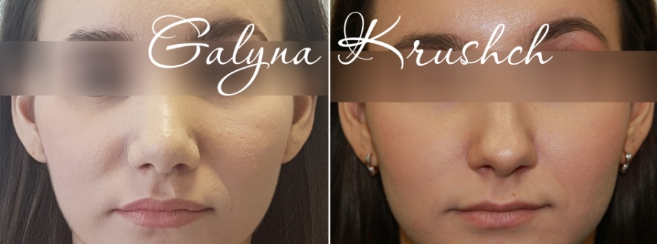 Женщина В, 37 лет, обратилась с жалобами на асимметрию ноздрей, подвижный при мимике кончик носа, носогубные складки. В анамнезе неоднократная коррекция гиалуроновыми филлерами носогубных складок, щечноскуловой области и ноздрей, последняя коррекция была проведена месяц назад. Эффектом контурной пластики пациентка неудовлетворена, так как асимметрия сохраняется и усиливается при мимике.