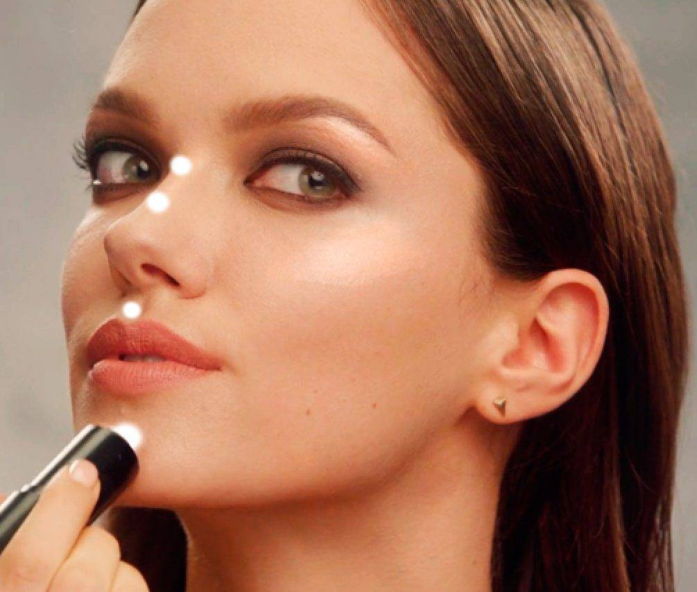 Также важно правильно нанести хайлайтер на нос, переносицу, под глаза и поставить точку на подбородке, чтобы сделать его более рельефным