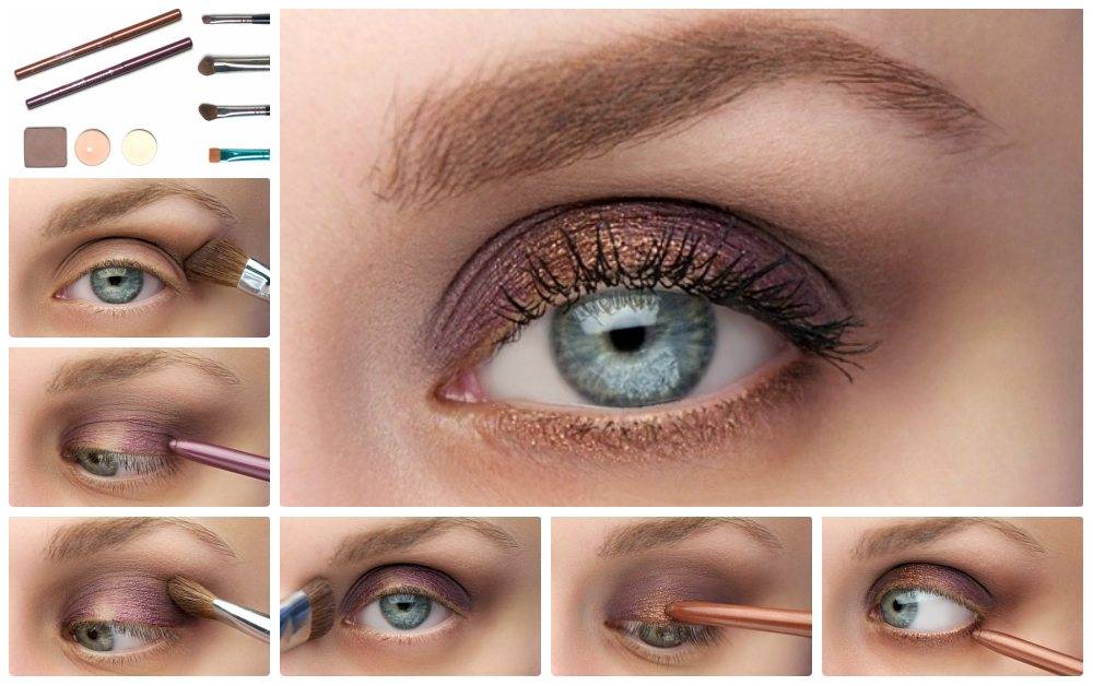 Переходим к следующему этапу- исполнению макияжа глаз. Вариант, предложенный ниже, одинаково хорошо подойдет девушкам с любым цветом радужной оболочки. Акцент в данном мейкапе поставлен на блик цвета бронзы по центру верхнего века. Вам потребуются: перламутровые бронзовые тени или карандаш, бежевые и тауповые тени, карандаш баклажанного цвета, кисти и база. Пошагово инструкция создания макияжа выглядит так: