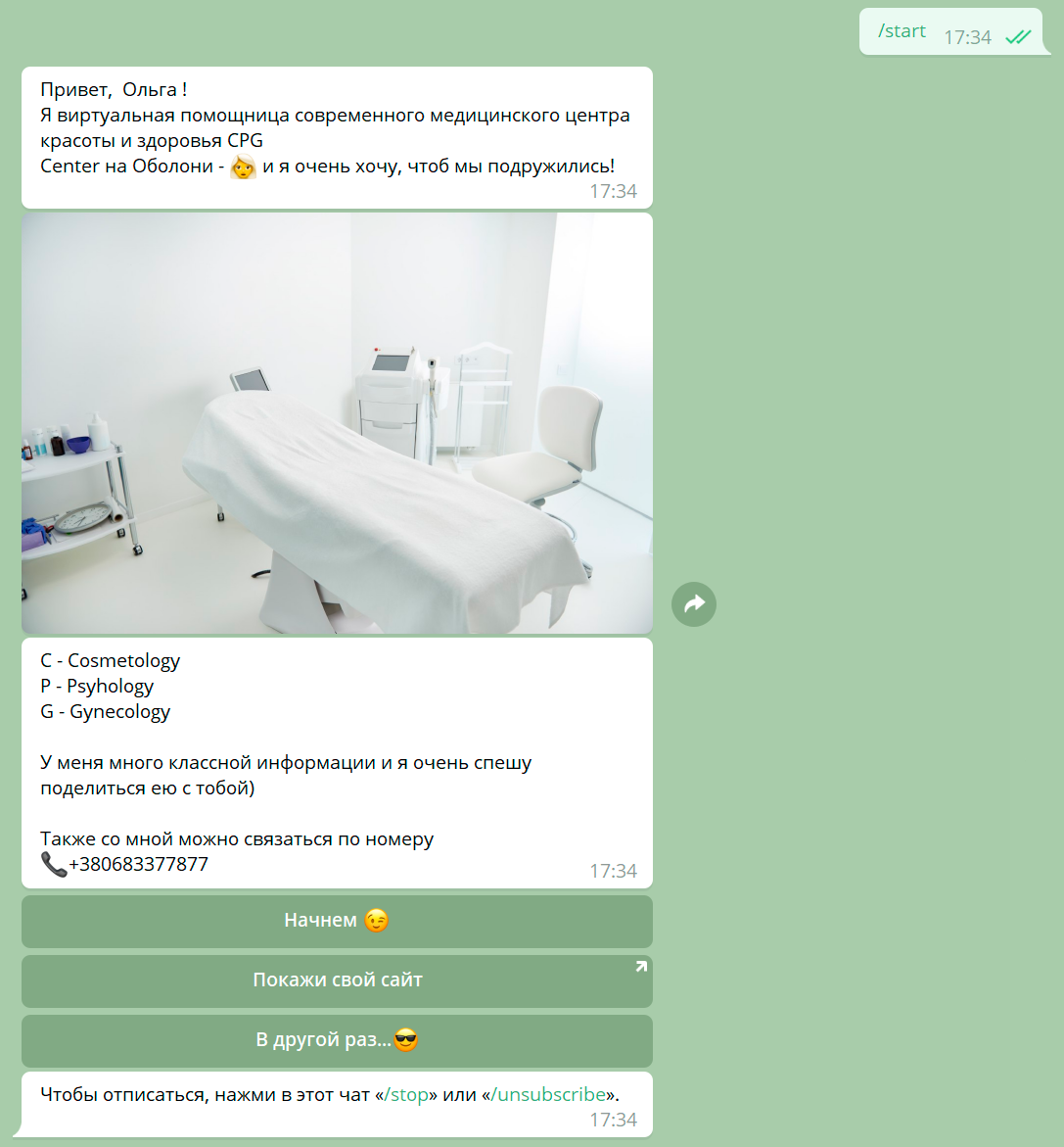Давайте посмотрим на приветственное сообщение бота CPG: