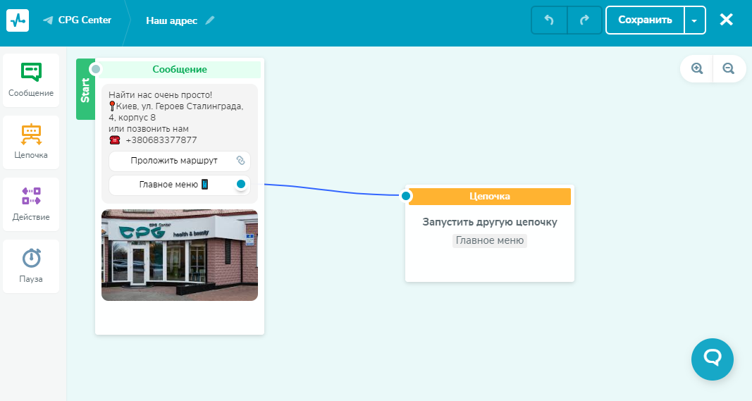 Чтобы пользователь мог найти клинику, в бота запрограммировали цепочку с адресом. По кнопке «Проложить маршрут» открываются «Google Карты», где уже отмечено местоположение клиники, пользователю остается лишь проложить маршрут к ней. Для удобства в сообщение добавили фото входа в клинику, так будет легче ее найти.