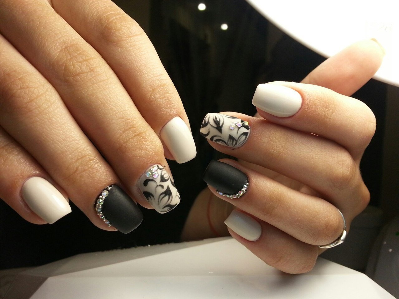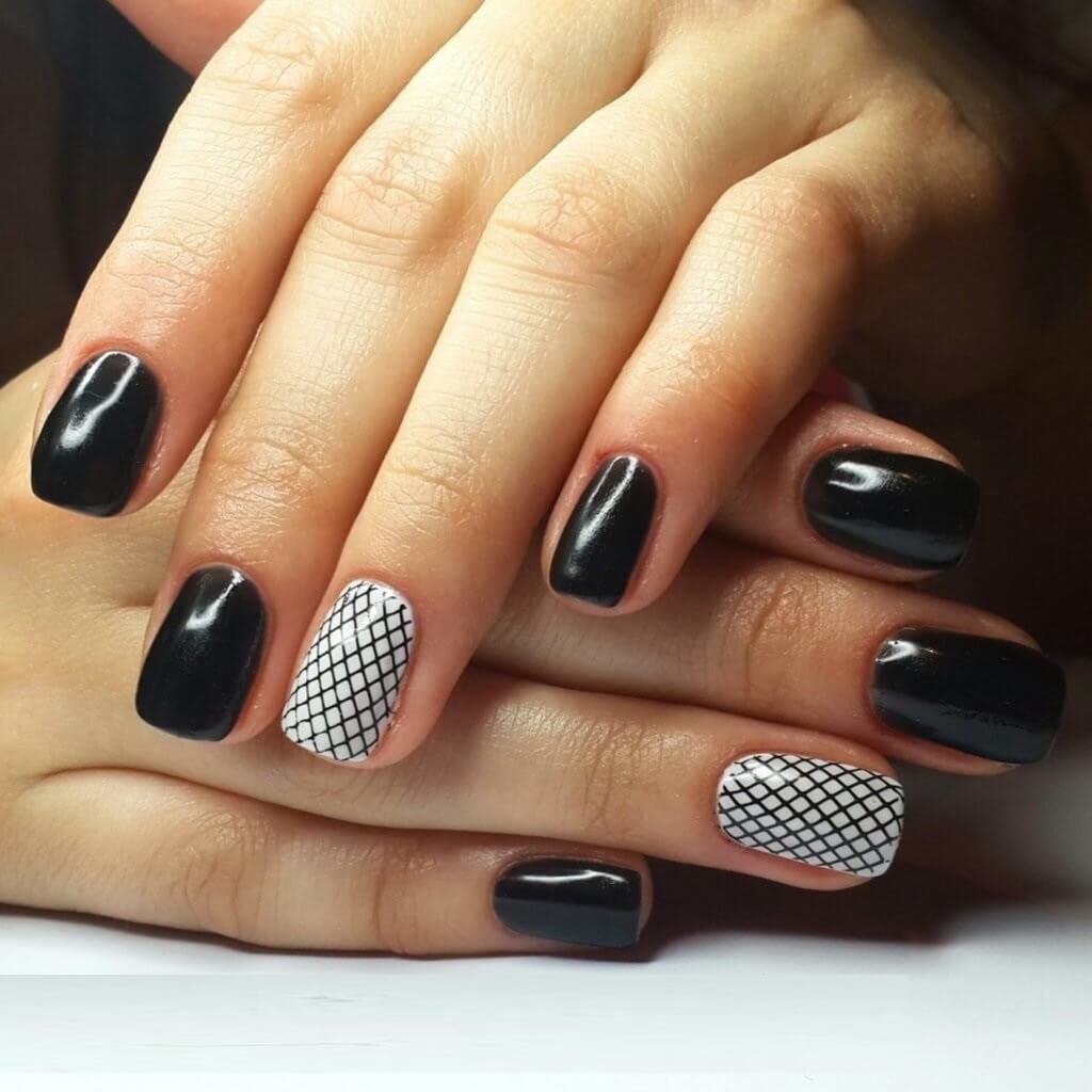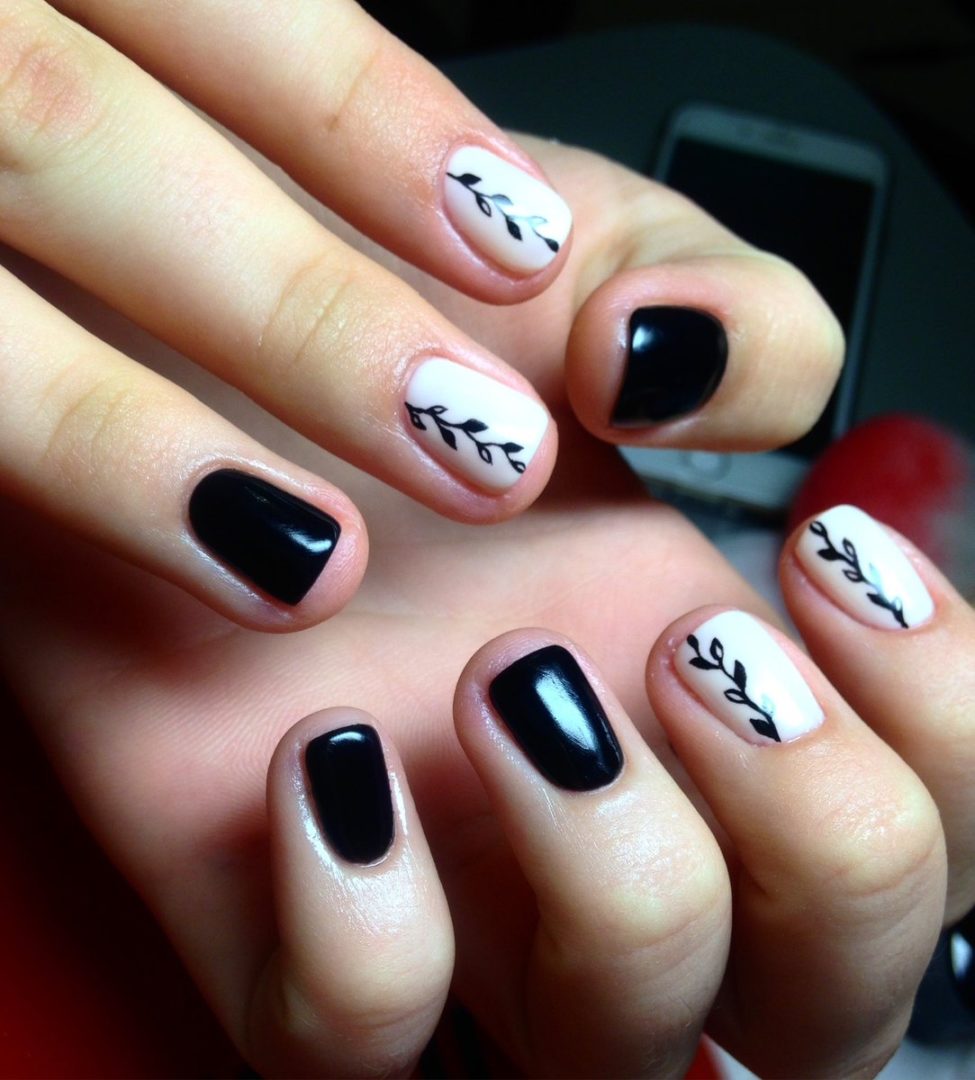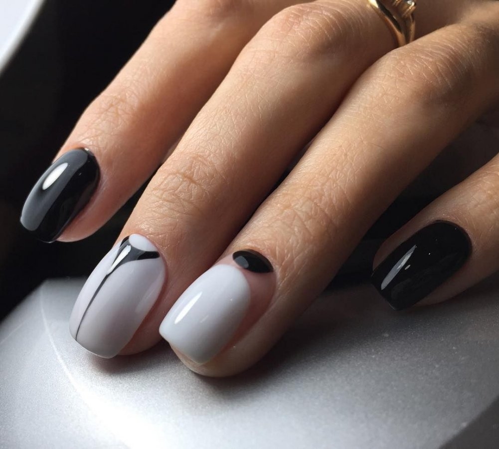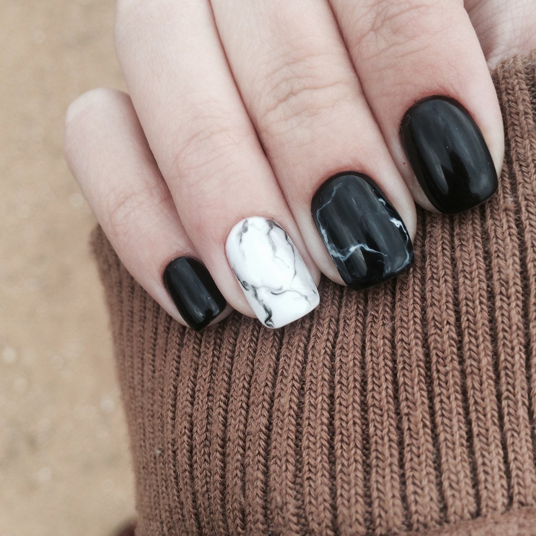 Вы также можете выбрать простой дизайн с великолепными деталями или ногти с инкрустацией, которые в настоящее время в тренде. Сочетание черного с белым на короткие ногти есть возможность выполнить в различных техниках, выделяя несколько ногтей.