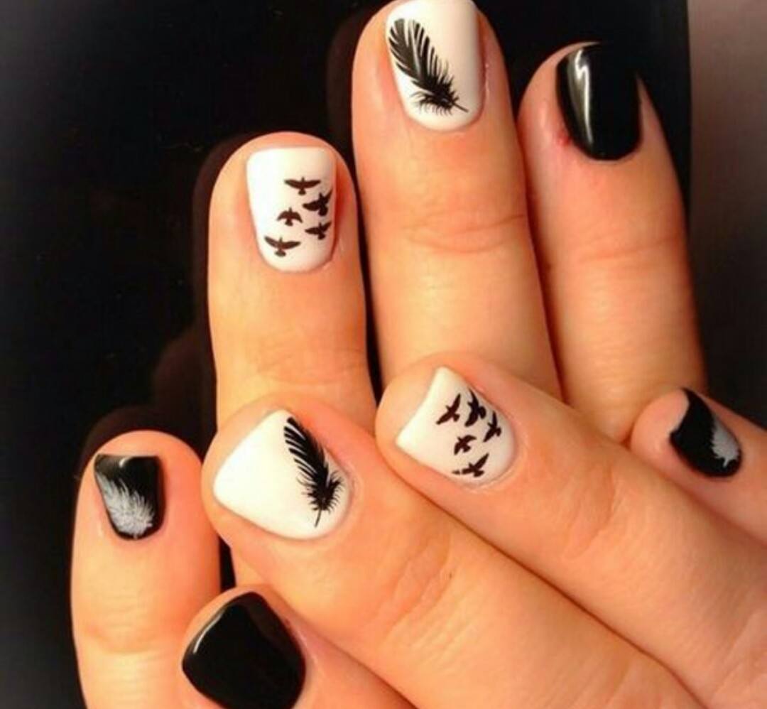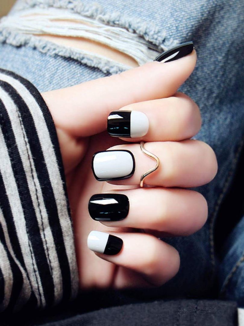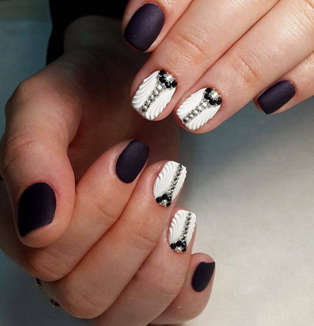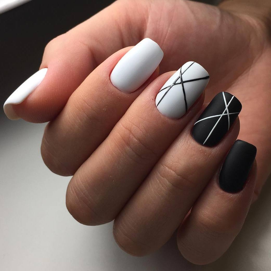 Вы также можете выбрать простой дизайн с великолепными деталями или ногти с инкрустацией, которые в настоящее время в тренде. Сочетание черного с белым на короткие ногти есть возможность выполнить в различных техниках, выделяя несколько ногтей.