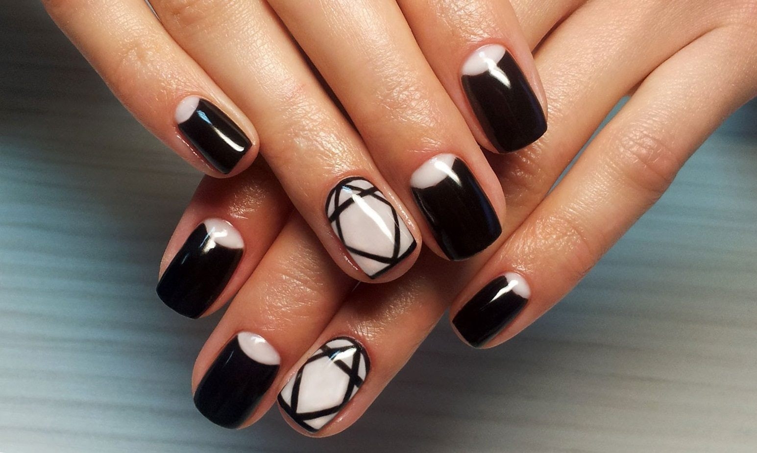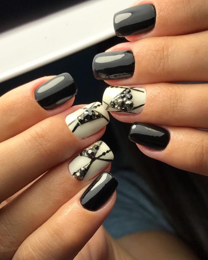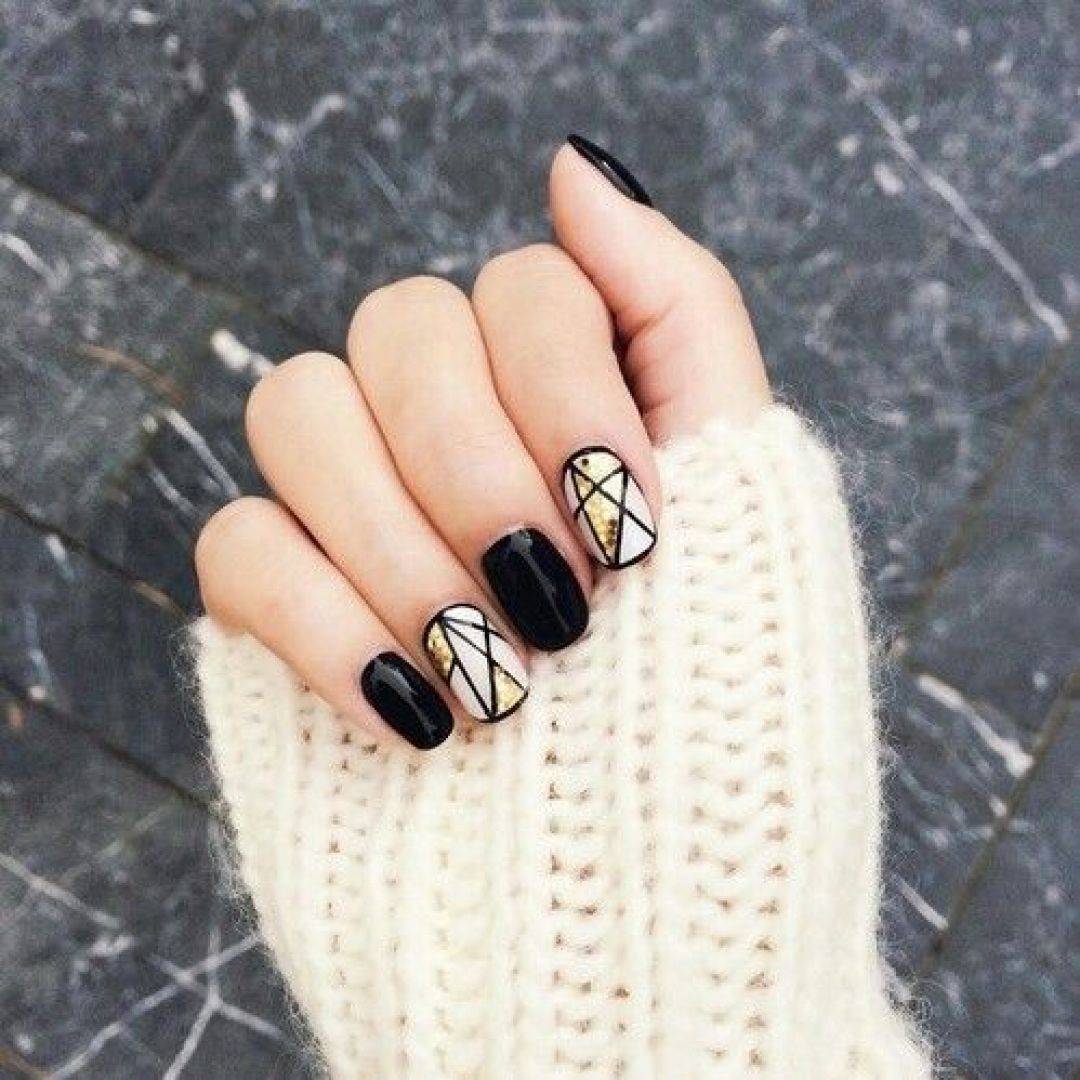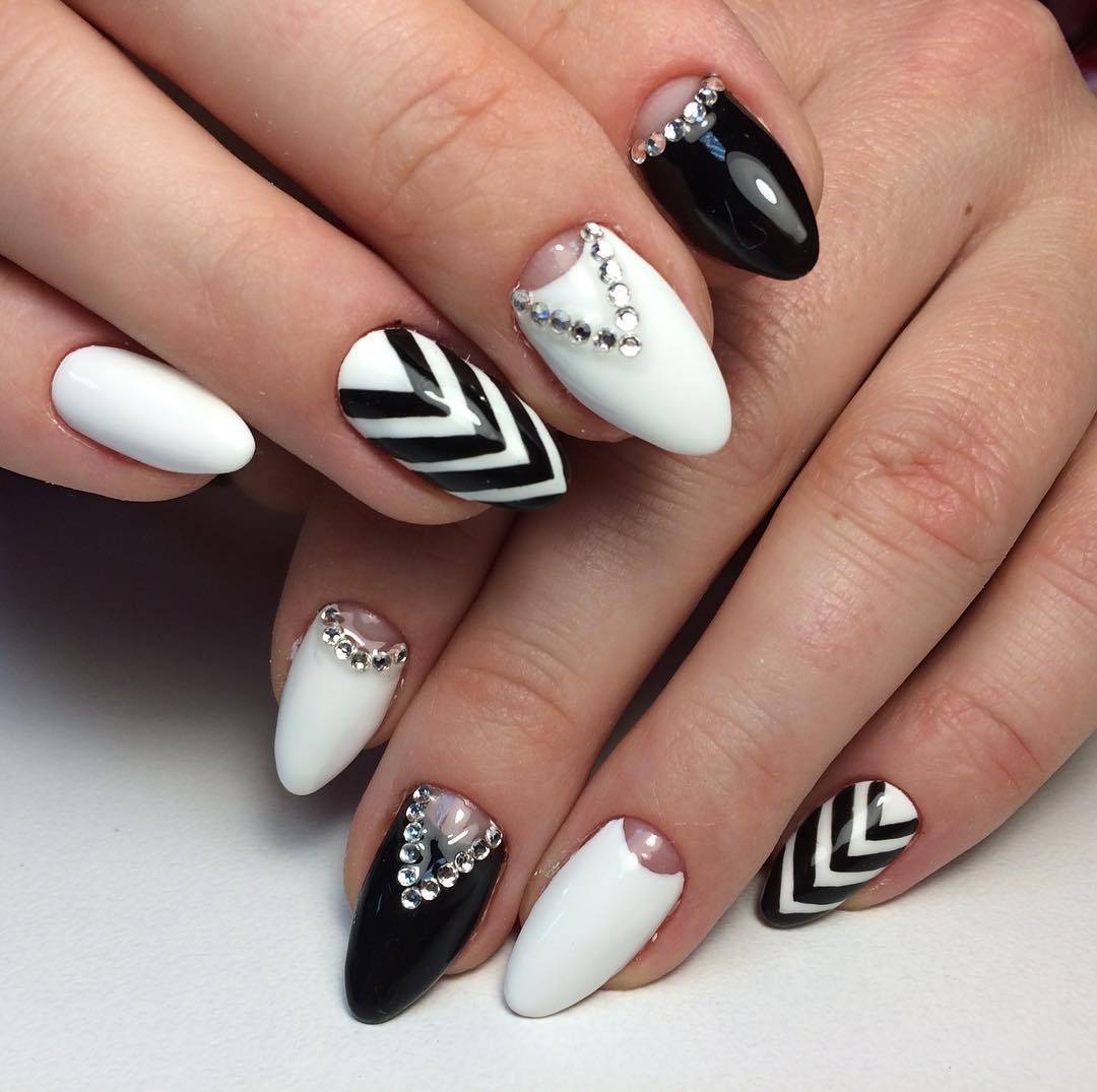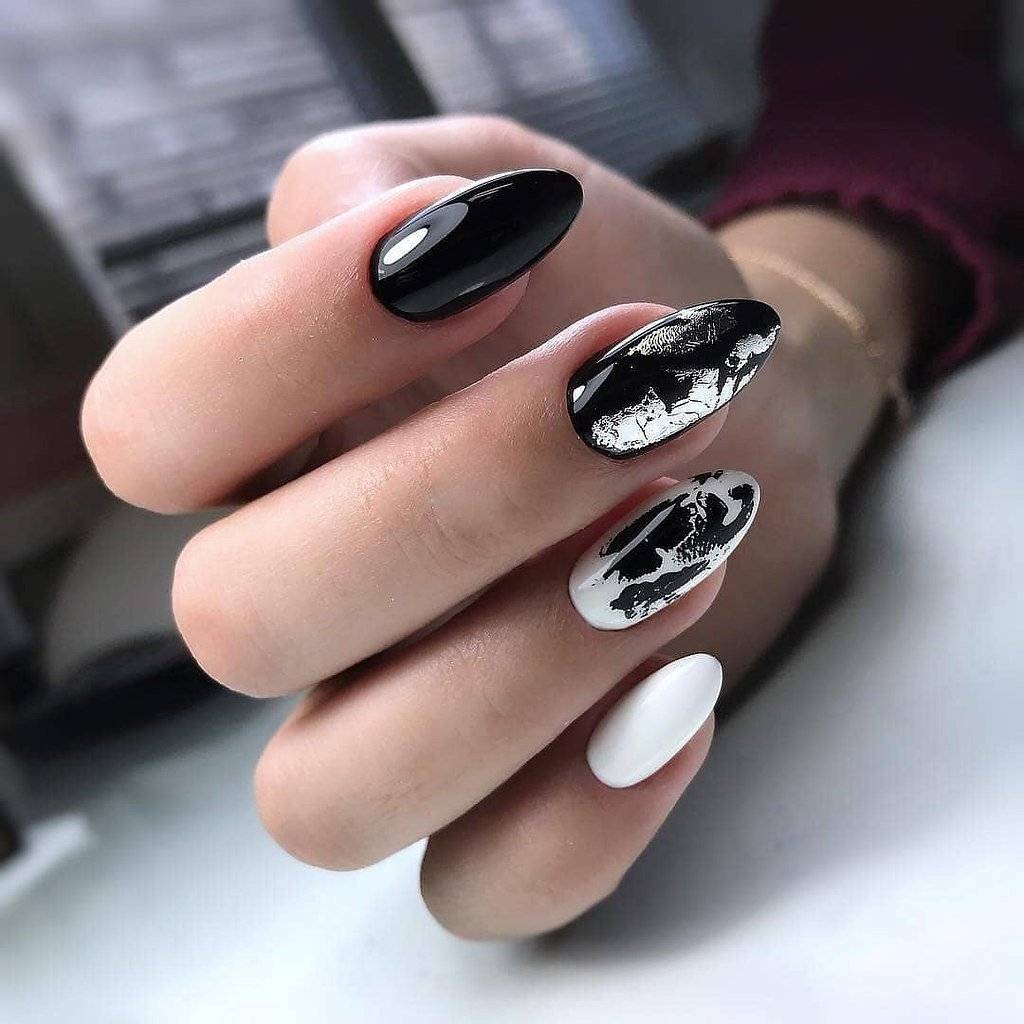 Вы также можете выбрать простой дизайн с великолепными деталями или ногти с инкрустацией, которые в настоящее время в тренде. Сочетание черного с белым на короткие ногти есть возможность выполнить в различных техниках, выделяя несколько ногтей.