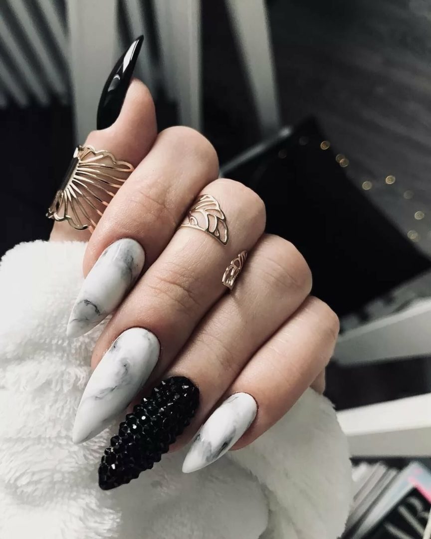 Почему мраморный дизайн ногтей всегда возглавляет список? Дело в том, что черно-белый мраморный дизайн ногтей выглядит очень гламурно, если добавить к нему немного блеска. Он станет стильным завершающим штрихом вашего интерьера. Если вам нужно более стильное решение, воспользуйтесь блестящей идеей.