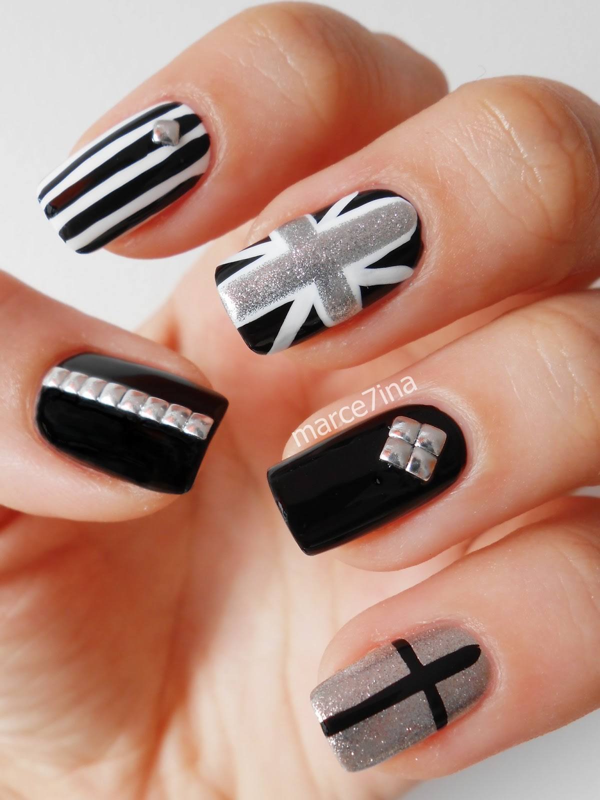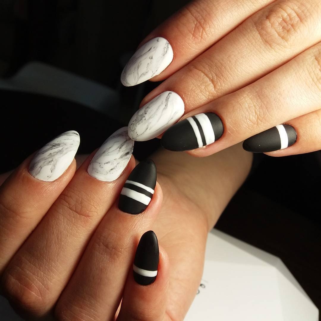 Набирает популярность мраморный маникюр, подходящий к ногтям небольшой длины, а также футуристический ромбовидный дизайн с глянцевыми витражами и гелевыми пластинами. В качестве новой черно-белой дизайнерской идеи возможно применение гель-лака, а также всевозможным металлических пигментов, а также набирающие популярность вставки.