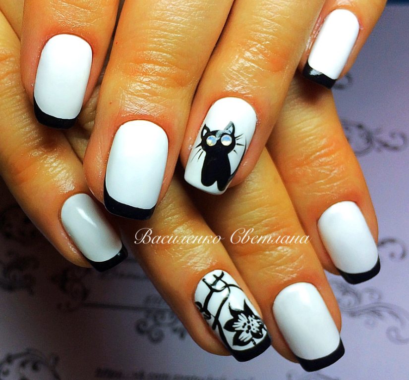 Черно-белый узор является воплощением элегантности и строгости. Несомненно, но эти цвета приемлемы и для молодежного повседневного нейл-арта с оригинальными узорами в виде головы Бэтмена или линий кардиограммы. Идей для контрастного маникюра множество, главное – проявить фантазию и нарисовать на ногтях то, что нам нравится. Это могут быть перья, кошачьи лапы, одуванчики и надписи.