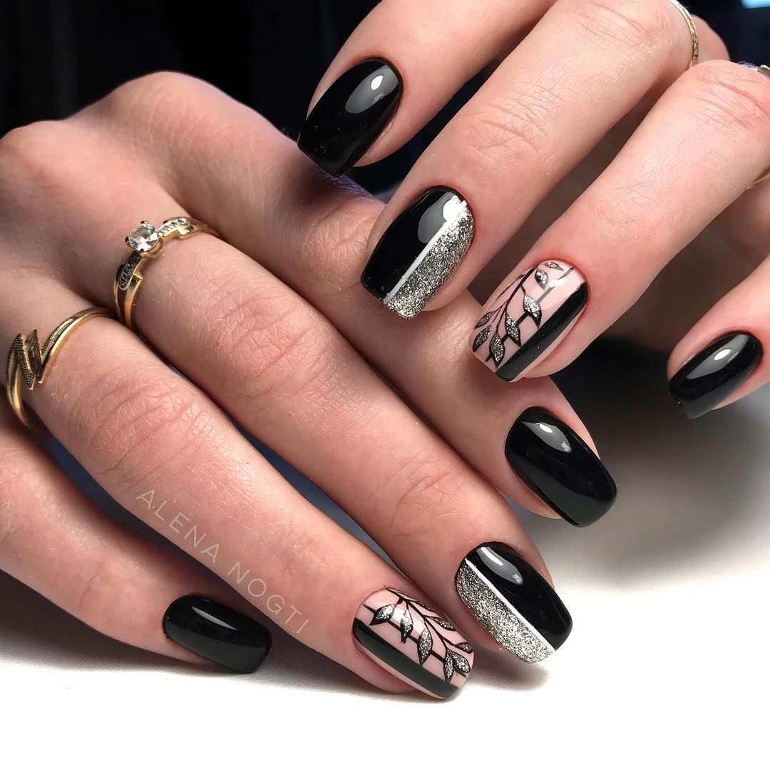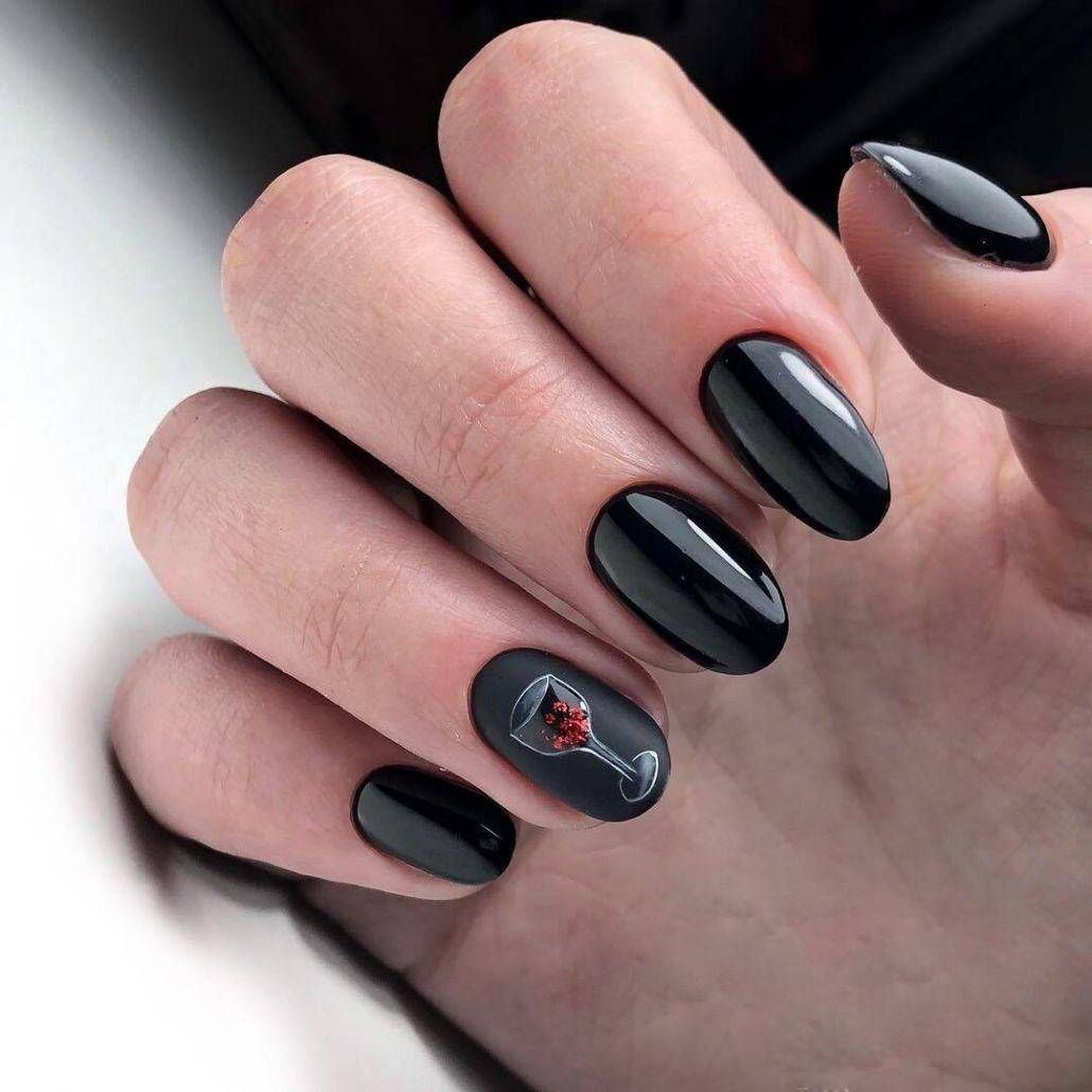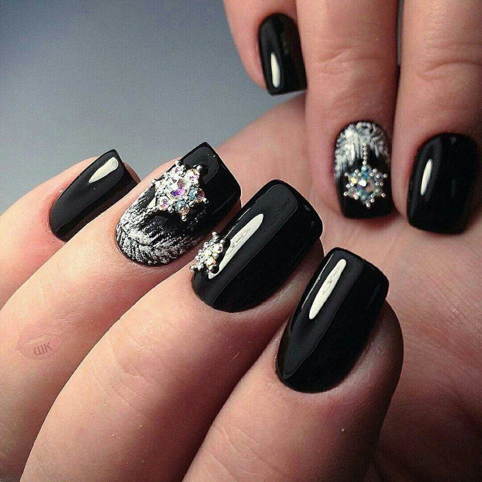 Для создания черного элегантного образа в новый год, в качестве дополнения к образу стоит сделать черный маникюр с блестками. Они делают дизайн интересным и праздничным. Черный фон используется для разных техник нейл-арта, к примеру для покрытия лаком кошачий глаз, чтобы цвет не плешивел и выглядел насыщенно.
