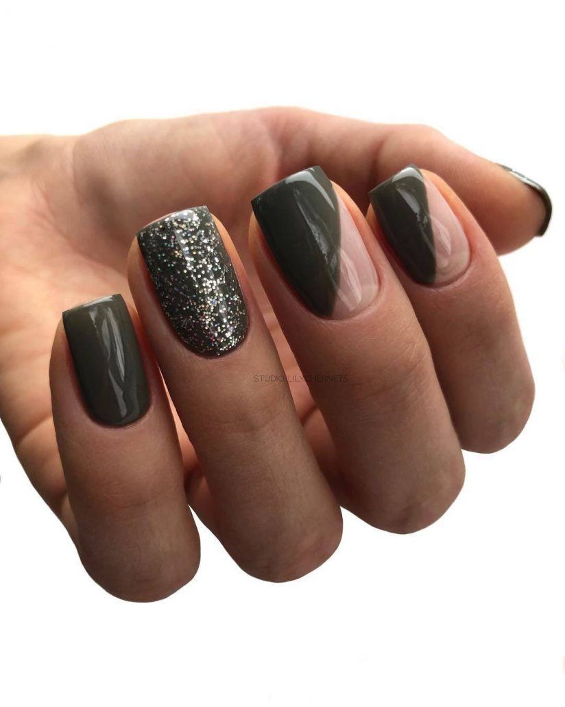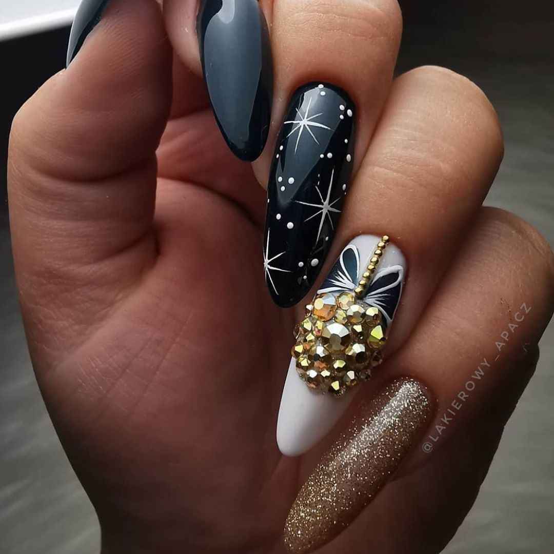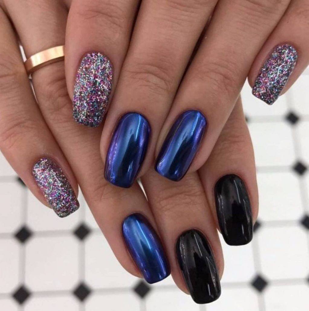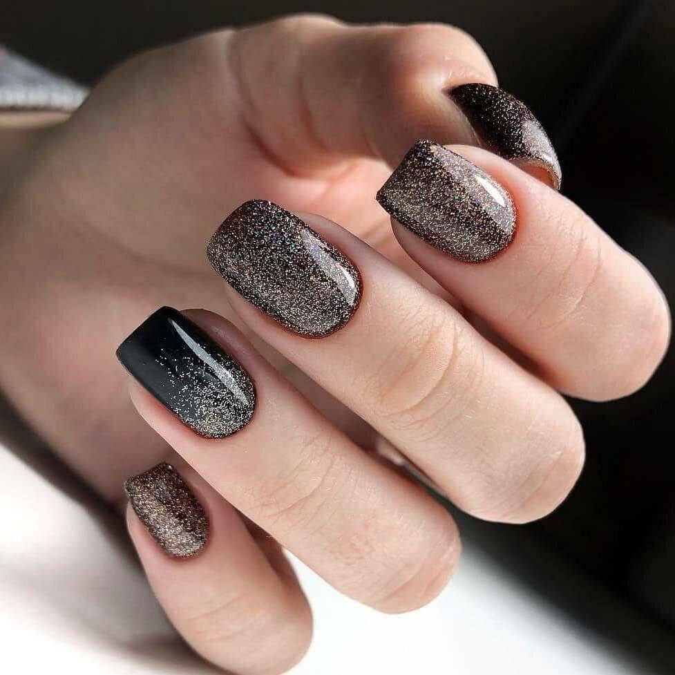 Для создания черного элегантного образа в новый год, в качестве дополнения к образу стоит сделать черный маникюр с блестками. Они делают дизайн интересным и праздничным. Черный фон используется для разных техник нейл-арта, к примеру для покрытия лаком кошачий глаз, чтобы цвет не плешивел и выглядел насыщенно.