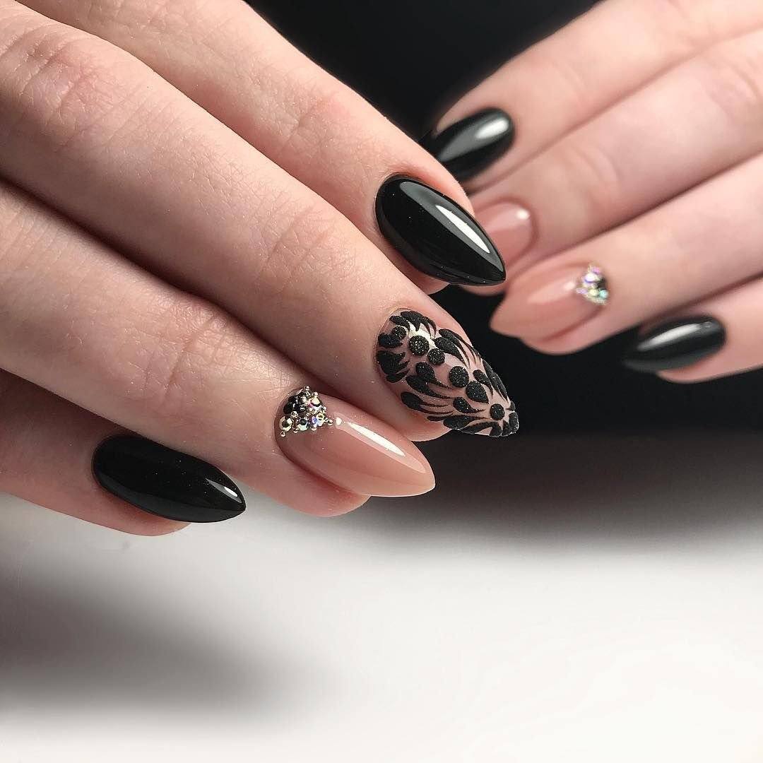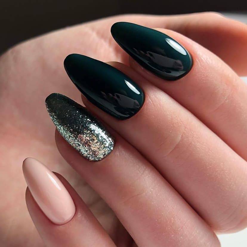 Стильно и эффектно будут смотреться длинные миндалевидные ноготки черного цвета, украшенные серебристыми блестками.