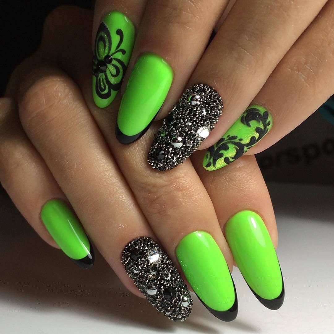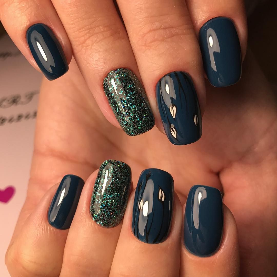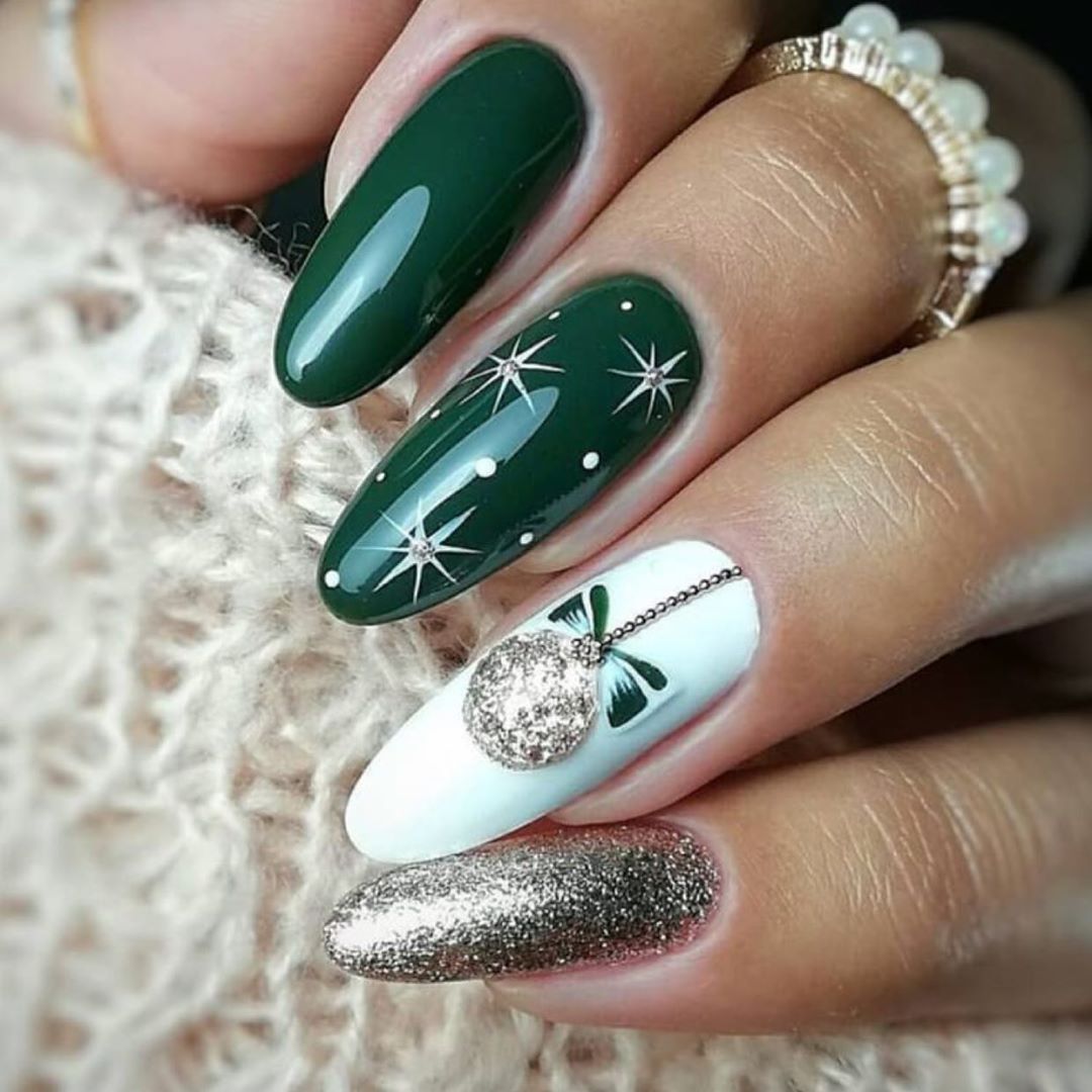 Зеленый цвет вместе с сочетанием красного и белого символизирует новый год. Подойдет для длинных и коротких ногтей. Благодаря большому выбору оттенок может быть использован для френча или лунного маникюра. Красиво смотрится в естественном цвете монохрома и малахита.