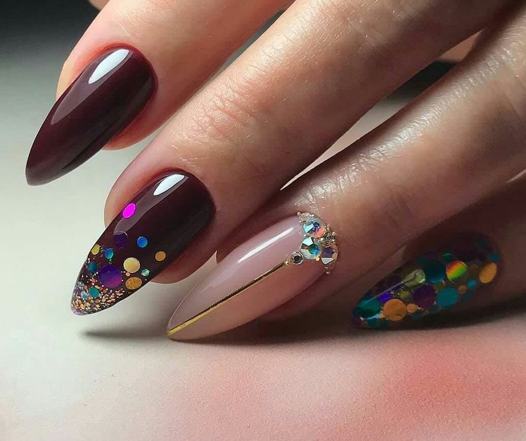 Выбирая подходящий вариант, обратите внимание на декор, чтобы придать маникюру законченный праздничный внешний вид. Выбор можно сделать в пользу элементов с глянцевым эффектом, акцентных вариантов или в тон покрытию