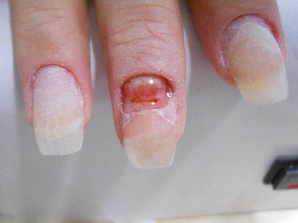 - При образовании раны не рекомендуется обрабатывать жидкостью для снятия лака. Химические растворы негативно повлияют на заживление ссадины. В подобной ситуации рекомендуется оставить повреждённую поверхность в состоянии «покоя», отрезать оставшиеся ногти, для придания эстетичного вида и заняться лечением.