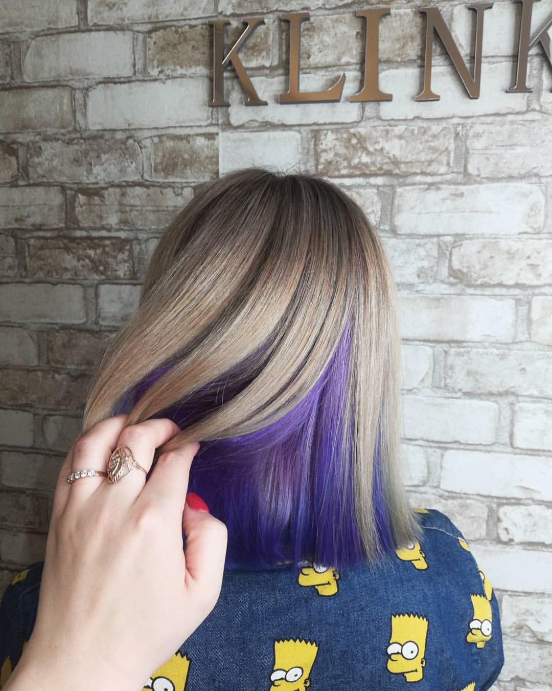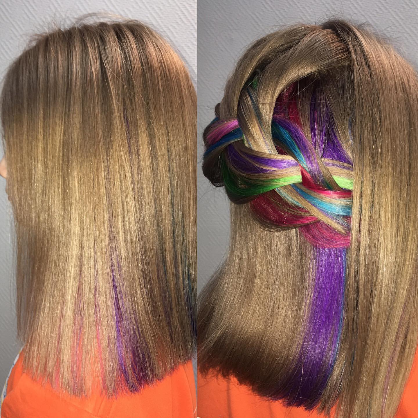 Скрытое окрашивание предполагает окрашивание только нижних прядей ваших волос. Для этого мастер отделяет часть верхних волос от нижних и закрепляет их на макушке. А нижние прядки выкрашивает в радужные цвета или в один выборочный, яркий тон.