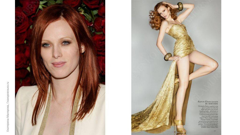 На фото – известная английская модель Карен Элсон, прекрасный пример осенней женщины с яркими бирюзово-голубыми глазами. Светлая кожа оттенка шампанского, рыжие волосы.