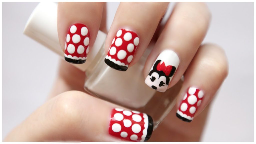 - Маникюр в стиле Микки Мауса. На ногти наносятся мордочки популярных героев, на другие всеми известные ушки, на следующие бантик Минни. Получается очень ярко и сразу можно узнать из какого мультика.