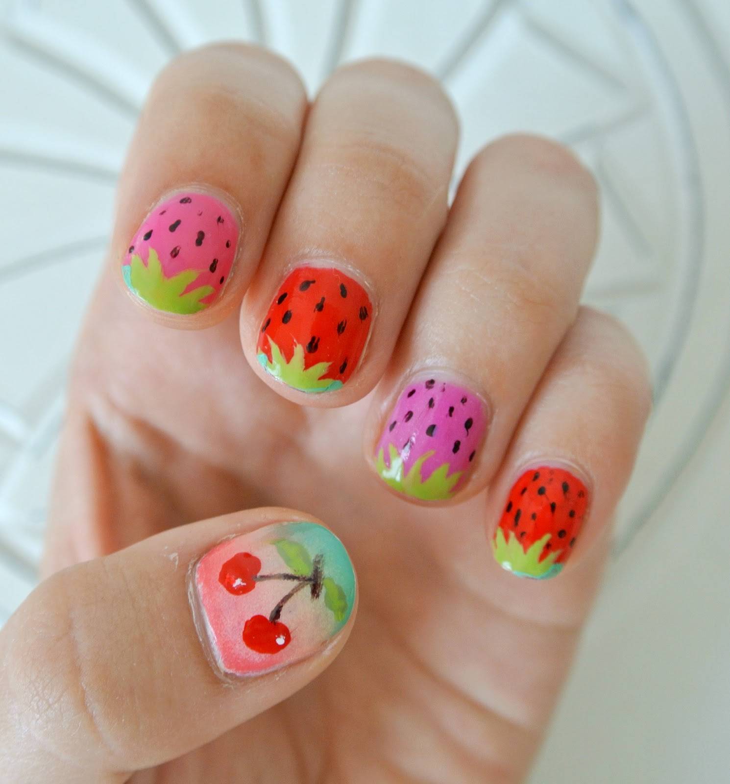 На каждом ноготке может нарисован разный фрукт, или же ассорти на одном.