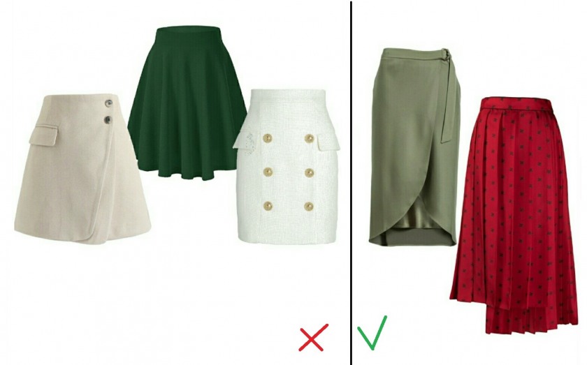 При выборе материалов ориентируйтесь на матовые ткани средней плотности. Твид и другие плотные ткани увеличат бедра и сделают низ фигуры непропорционально большим. Прозрачные, блестящие, эластичные ткани также противопоказаны, так как подчеркивают полные бедра.