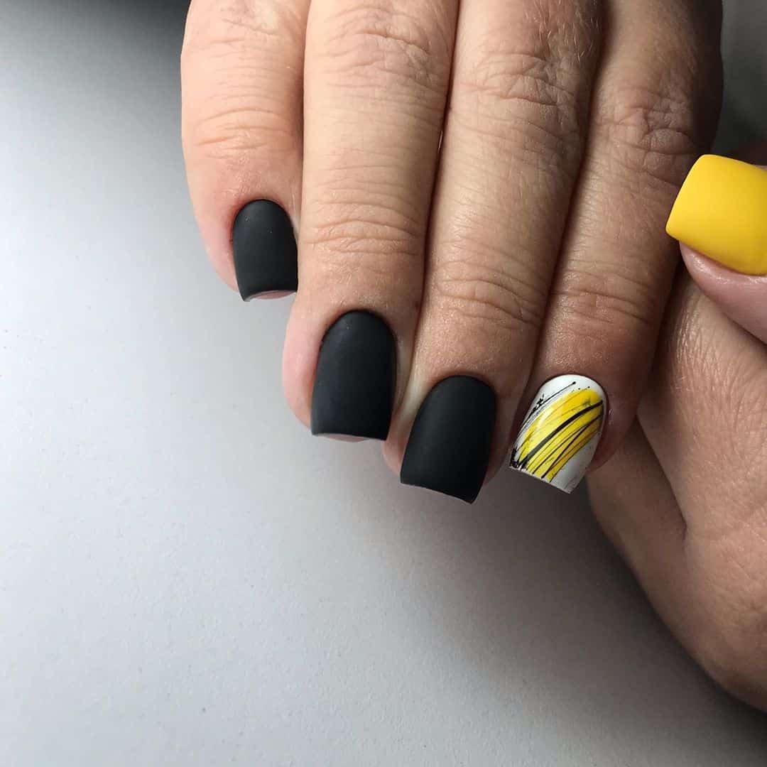 Матовый является не практичным, из-за пористой текстуры быстро грязнится, но если делать маникюр в темных тонах, то загрязнения будут почти не видны. Делая матовый маникюр на короткие ногти не стоит выбирать светлые и утонченные рисунки, лучше добавить блесток, чтобы скомпенсировать нейтральность.