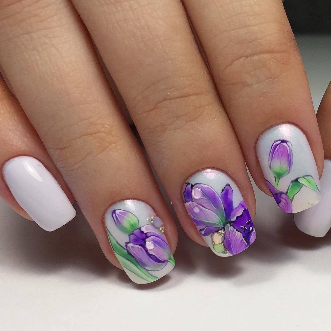 Также акрилом можно сделать френч и оформить его оригинальным флористическим рисунком. Техника росписи акрилом удобна тем, что если узор не получился, то его можно просто смыть водой, пока он не засох и начать роспись сначала.