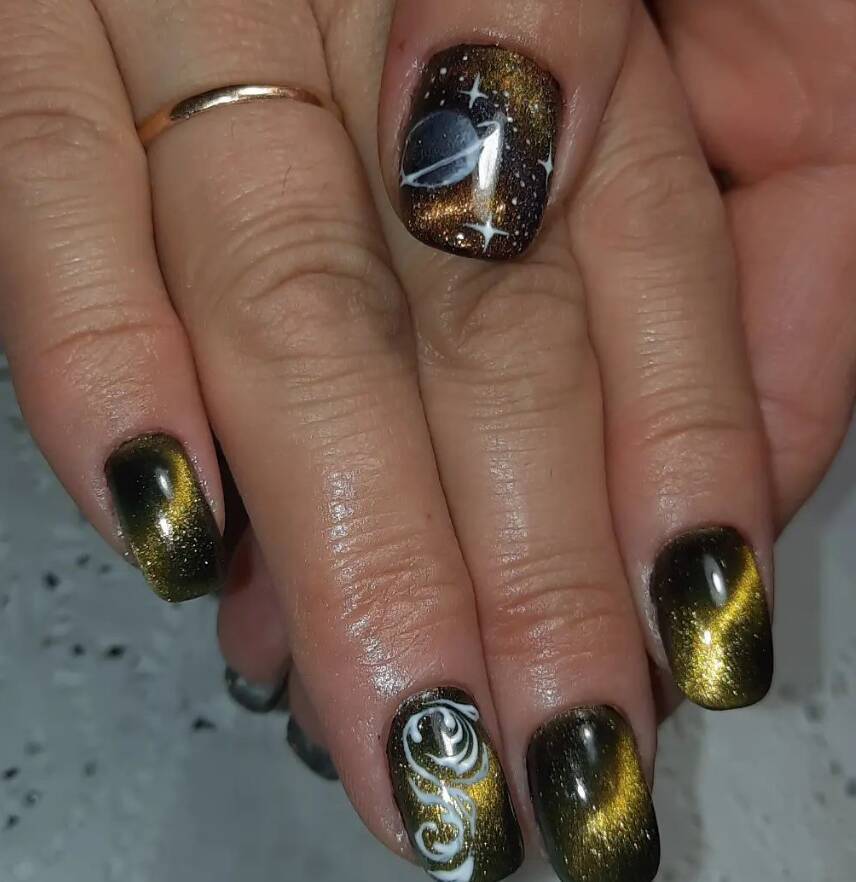 Такой маникюр отлично подойдет на короткие ногти, “кошачий глаз” – тип лакового покрытия в составе которого имеются мелкодисперсные отражающие элементы.