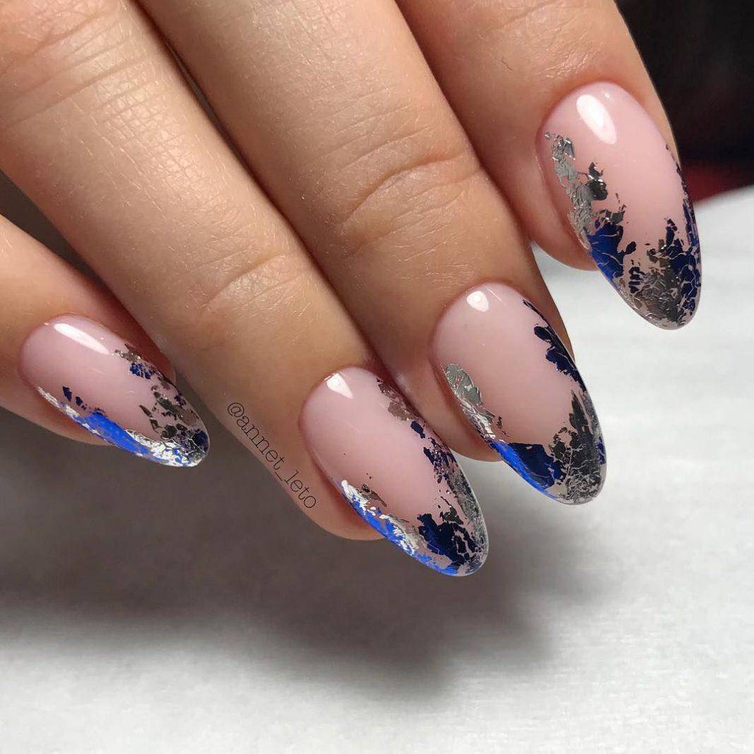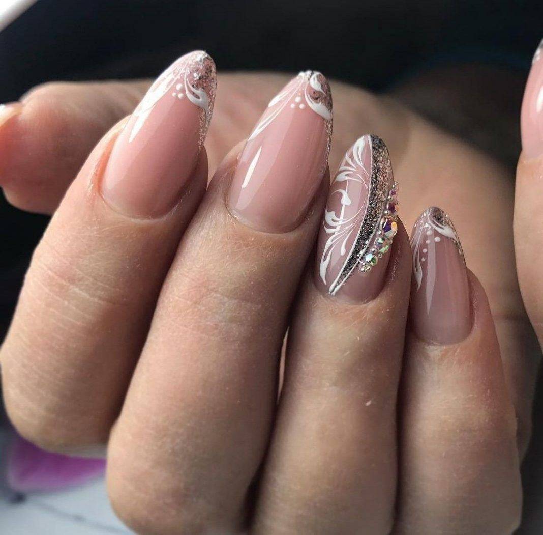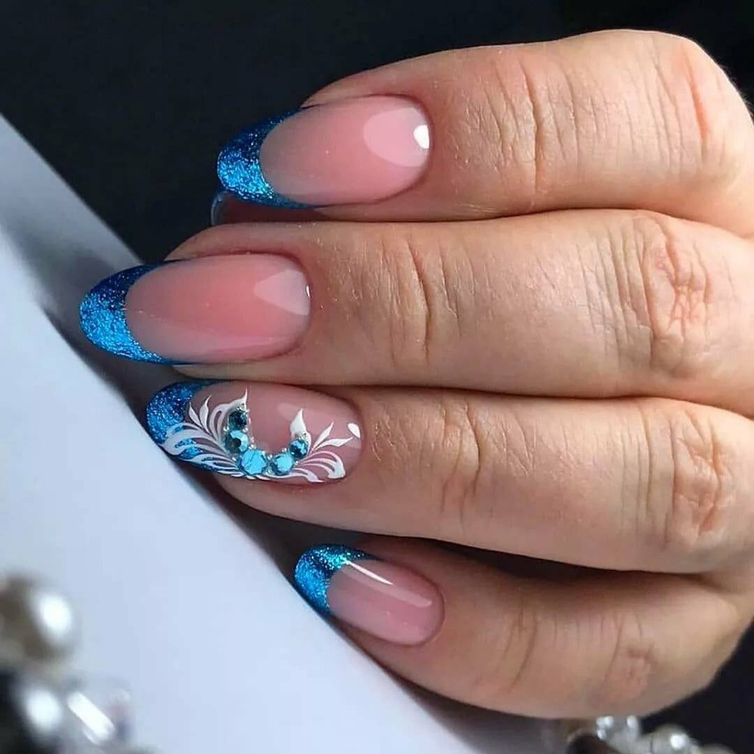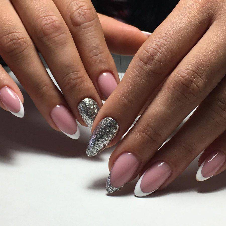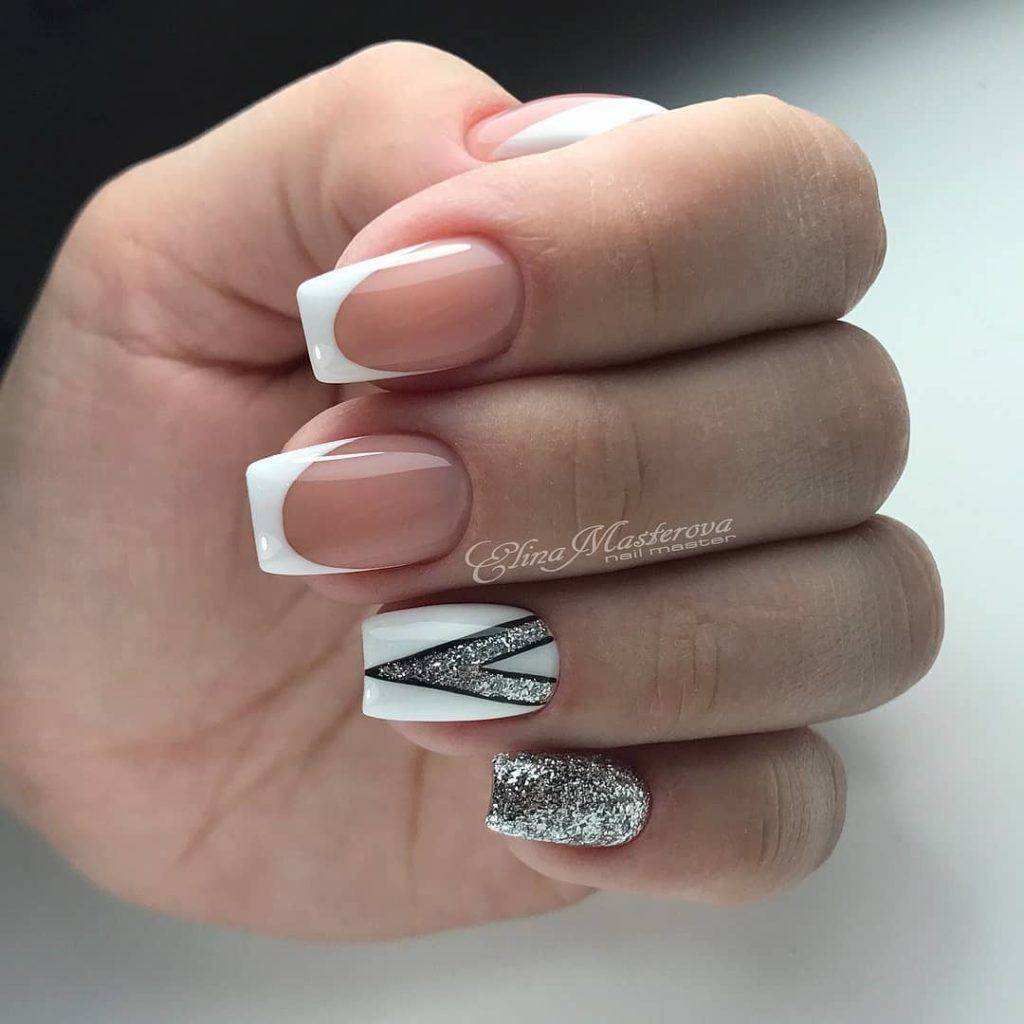 Также многие нейл-мастера используют блестки только в качестве акцента, а именно украшают ими рисунки. То есть изначально французский маникюр сочетают с вензелями, геометрическим дизайном, кружевными вставками и т.д. Когда все готово дизайн можно подчеркнуть блестками с помощью нанесения сухой кистью. В результате получается роскошный объемный маникюр с мерцающими деталями. Подходит он для любого случая, поэтому в 2020 году он особенно актуальный.