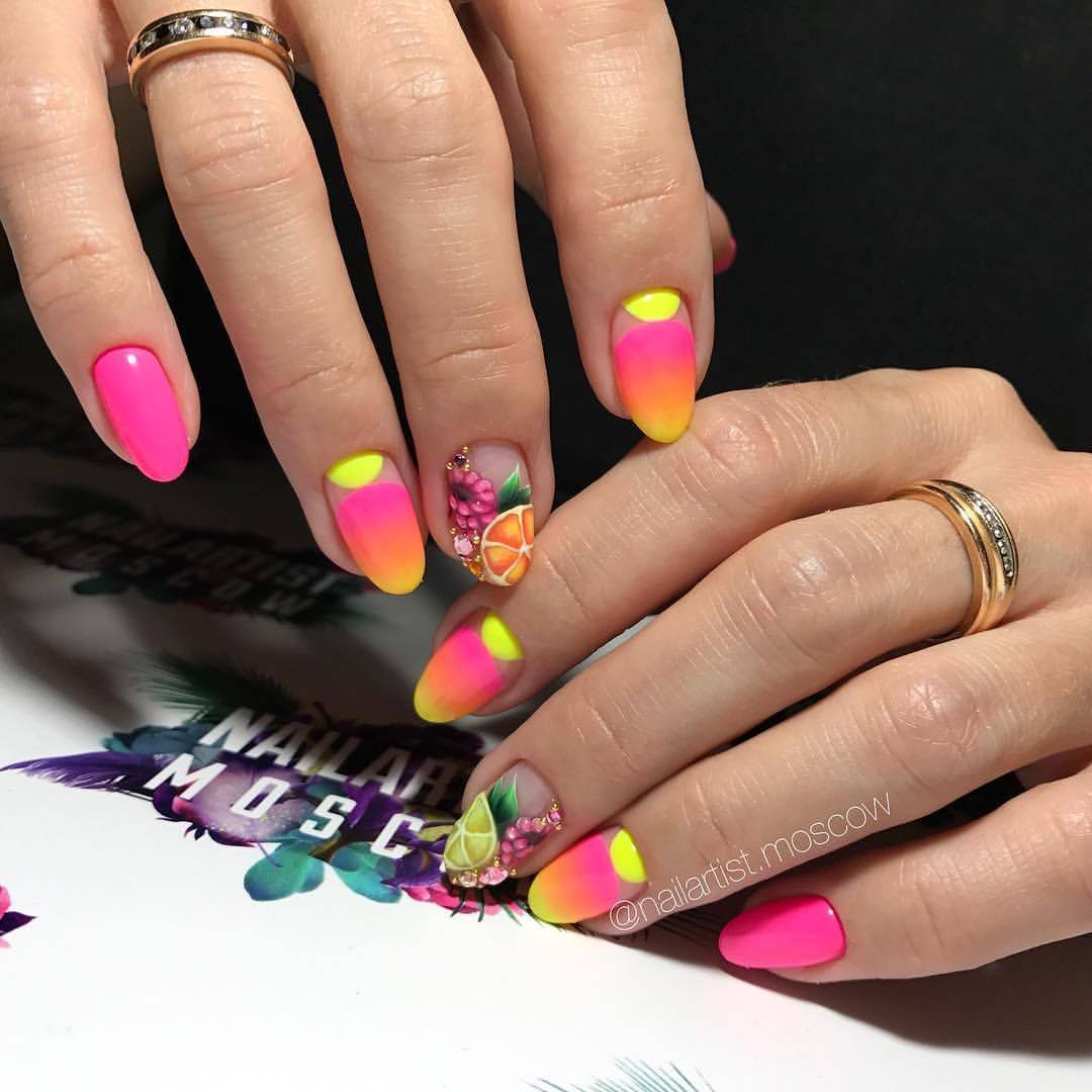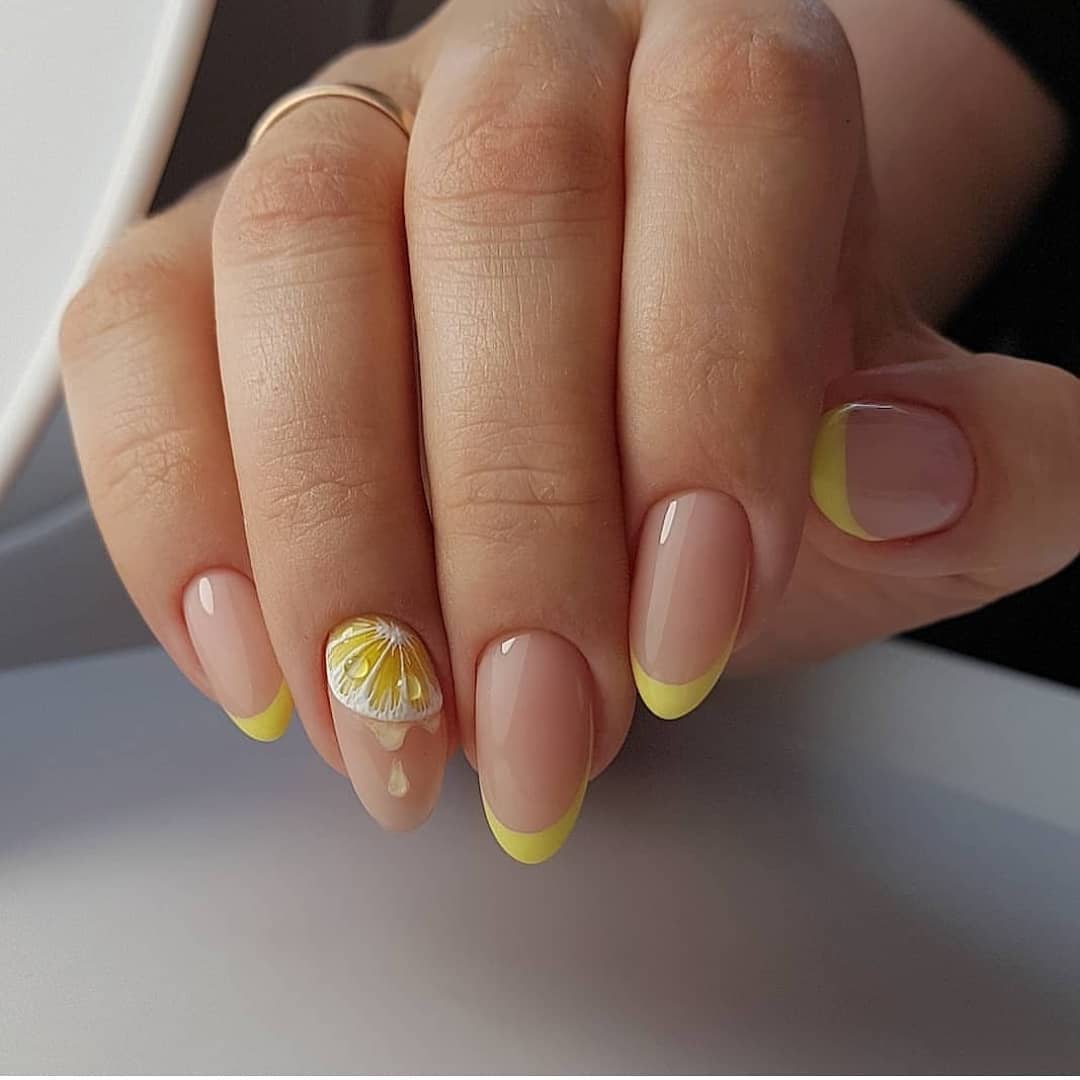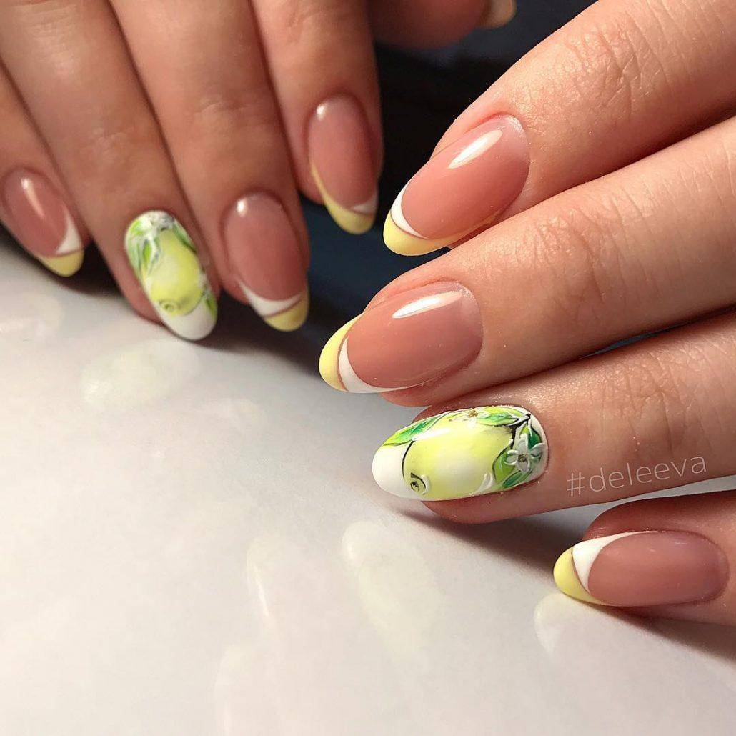 Цветной френч отлично гармонирует с декором в виде фруктов: лимонов, арбузов, в виде флористики, геометрии, мультяшными героями и т.д. Если вы используете яркий цвет для выделения края ногтевой пластины, то помните, что остальная часть ногтя должна быть окрашена в светлый оттенок. Это должен быть спокойный серый, молочный, полупрозрачный оттенки.
