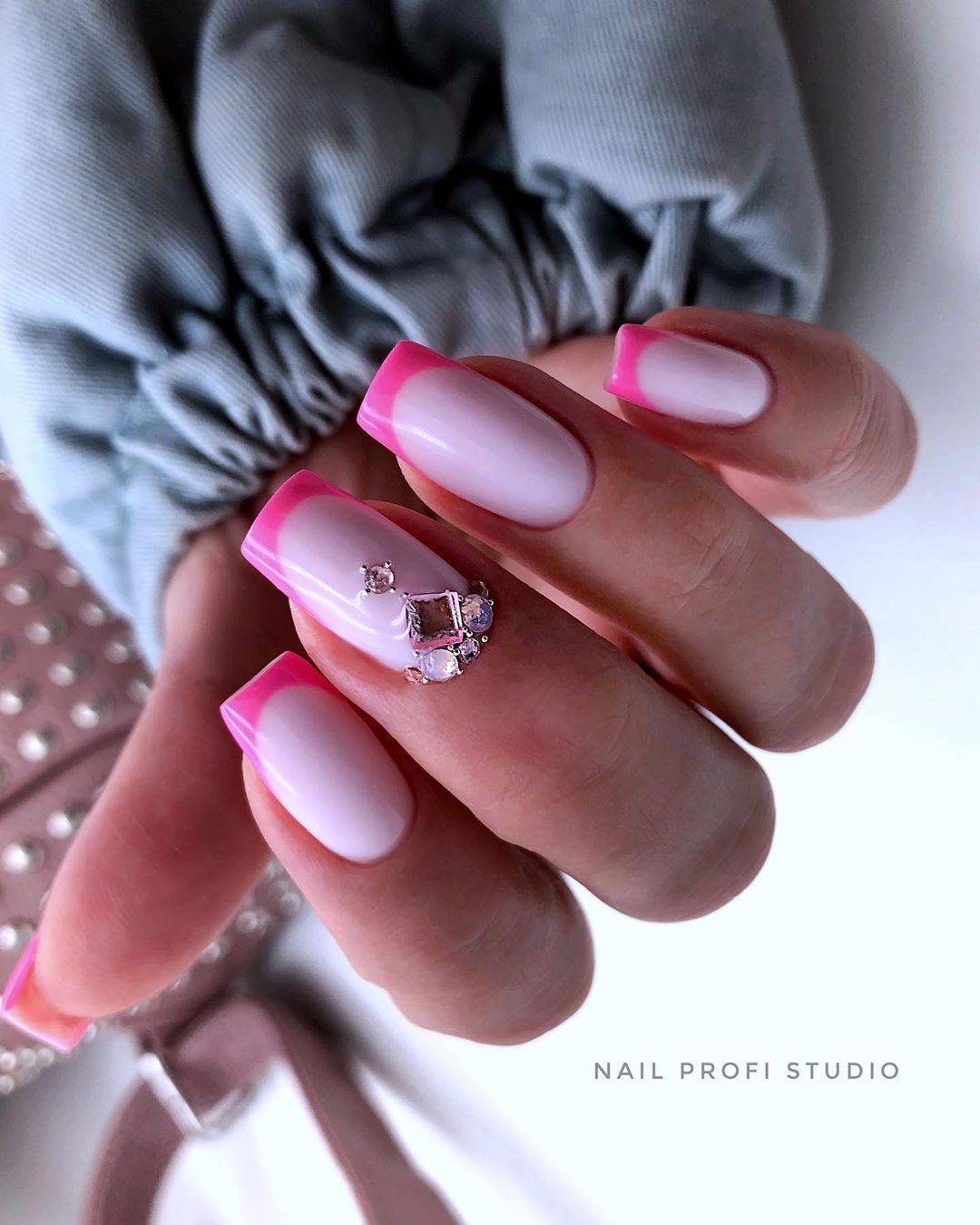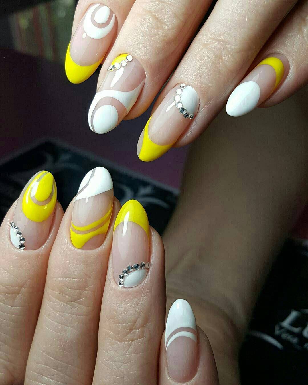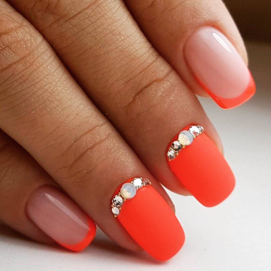 Очень выразительно решение, выполненное цветными камешками. Игра противоположных цветов смотрится очень подходяще на умеренном французском маникюре.