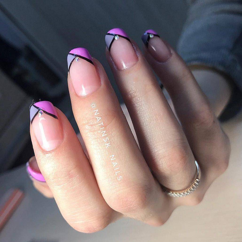 Не стоит делить мир и маникюр на белые и черные цвета лаков. Яркий френч тоже актуален и имеет право на существование. Нельзя сказать, что это новинка, но попробовать можно: яркие кончики ногтей, контрастные или очень близкие цвета. Можно использовать два цвета: всю пластину красим сиреневым, а линию улыбки – фиолетовым. На следующем ногте можно сделать её сиреневой, а пластину – фиолетовой и т.д.