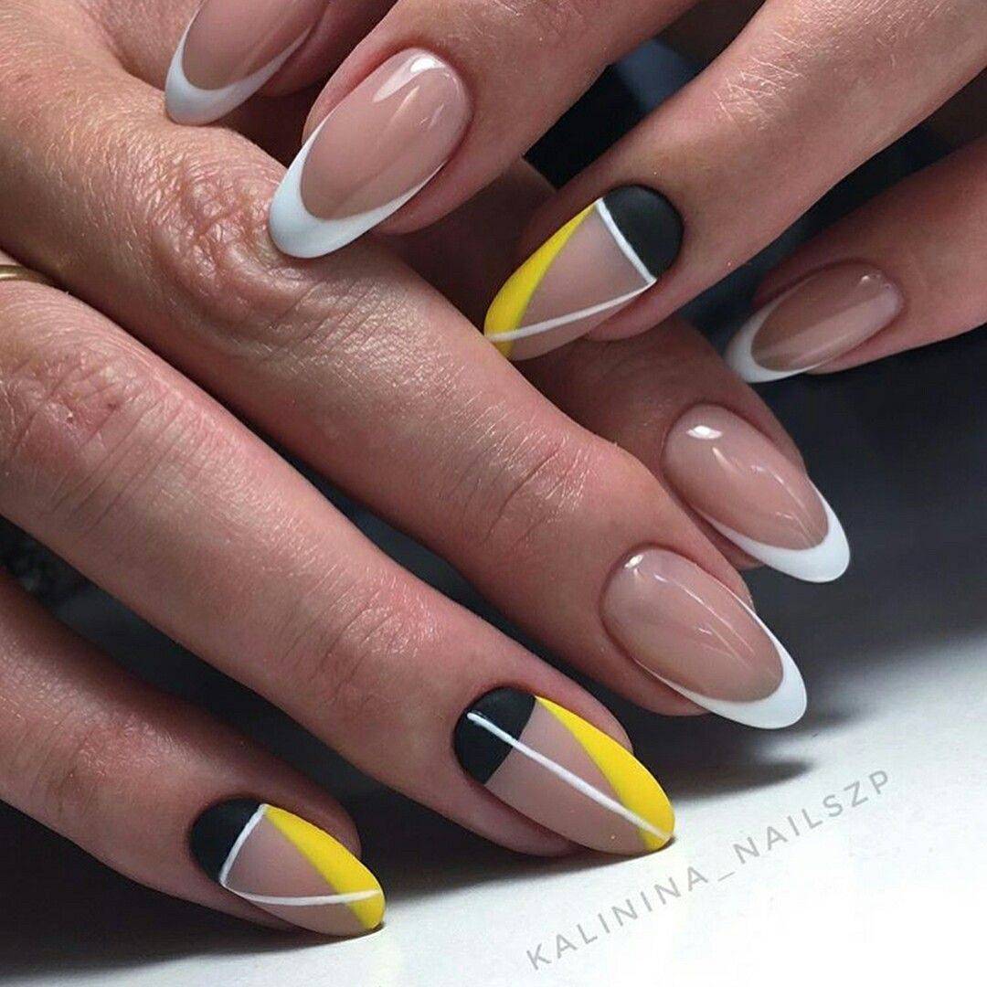 Френч настолько универсальная техника, что может выглядеть оригинально в любой цветовой гамме. В весенний и летний период популярностью пользуются сочные яркие нейл-арты в желтом, ярко-розовом, синем и даже черном цвете.