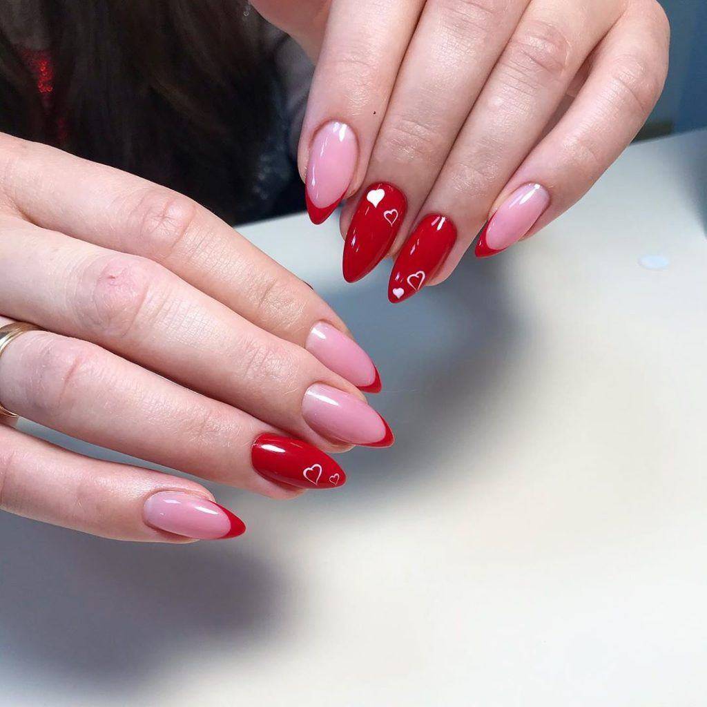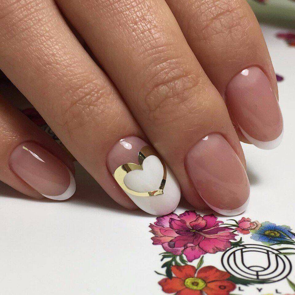 По сути здесь громадное раздолье для творчества и выдумки. Очень популярная в текущем году форма сердечка тоже очень симпатично смотрится на краешке ногтя.