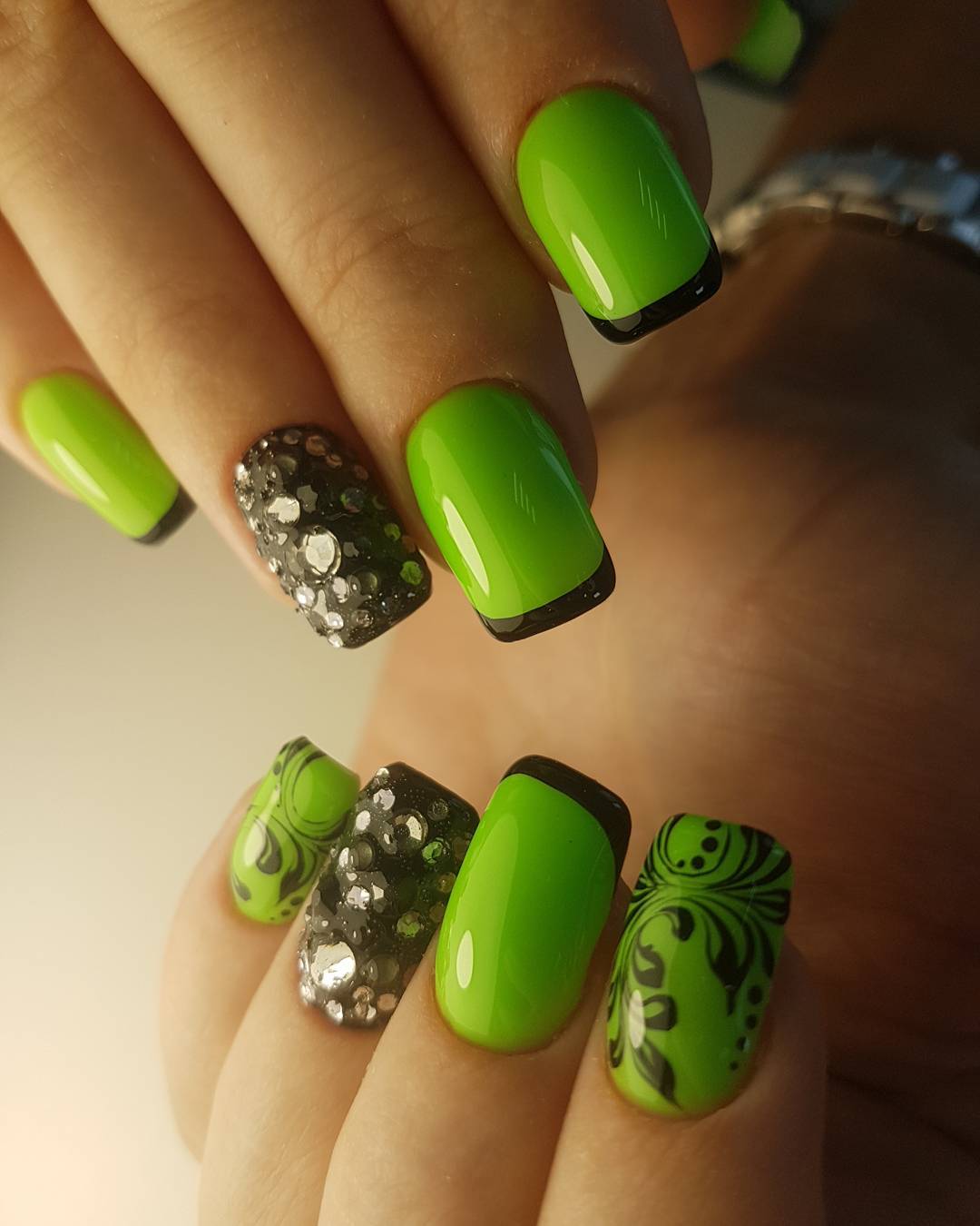 В таком случае блестки можно использовать, но также в небольшом количестве. Преимущественно их можно увидеть вместо точек или же на поверхности некоторых из линий. Для этого лучше использовать специальный лак, в составе которого уже содержаться блестки. Благодаря этому процесс оформления не займет много времени.