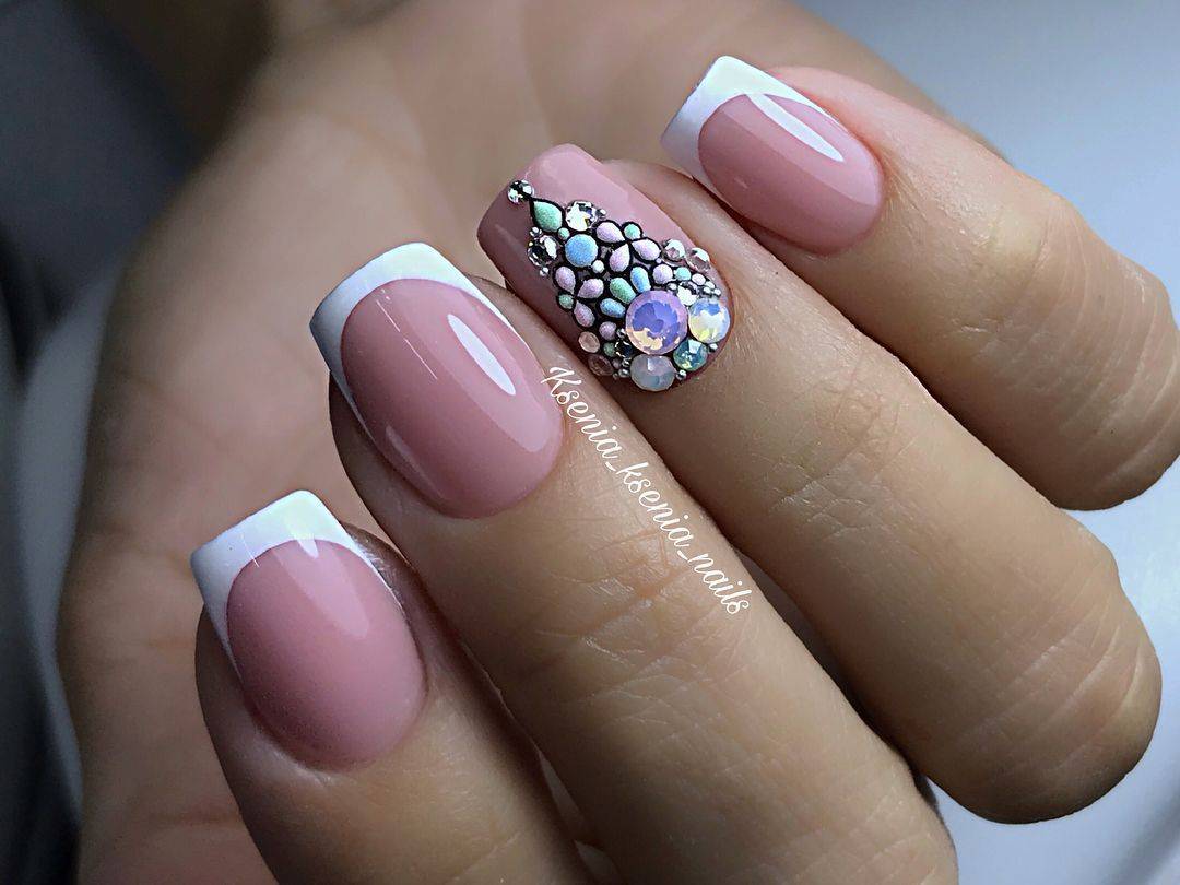 Французский маникюр сам по себе выглядит очень красиво. И в большинстве случаев он не требует дополнительных деталей. Тем не менее, не стоит отрицать популярность разнообразия актуальных видов дизайна, которые всегда дополняют маникюр и делают его более стильным, оригинальным.