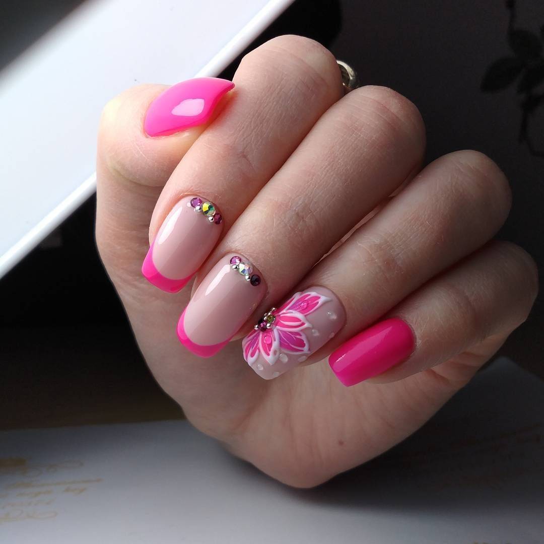 Не менее чудесно гармонирует держанный и аккуратный френч с иным дизайном. Это может быть геометрия или цветочная тематика.