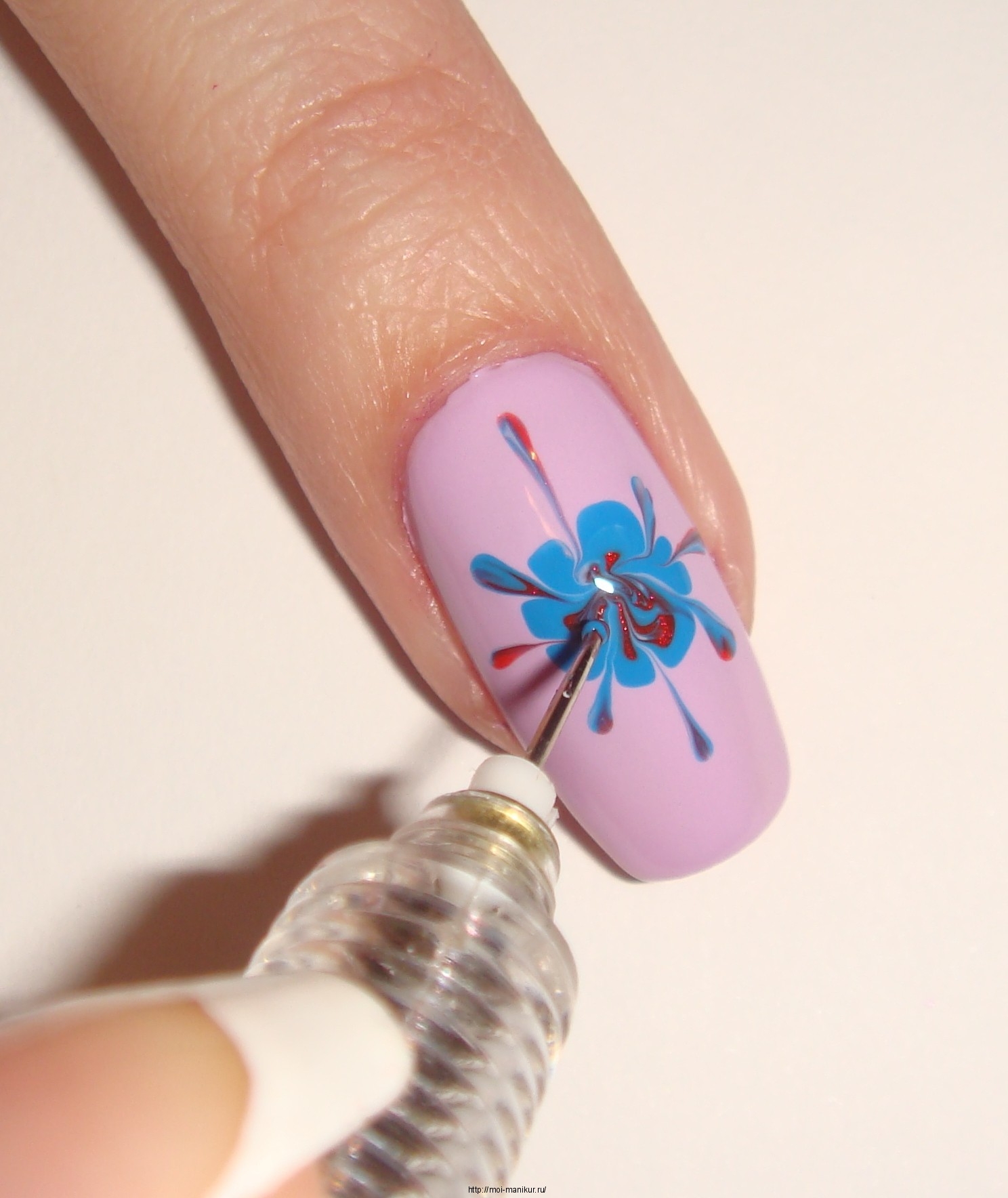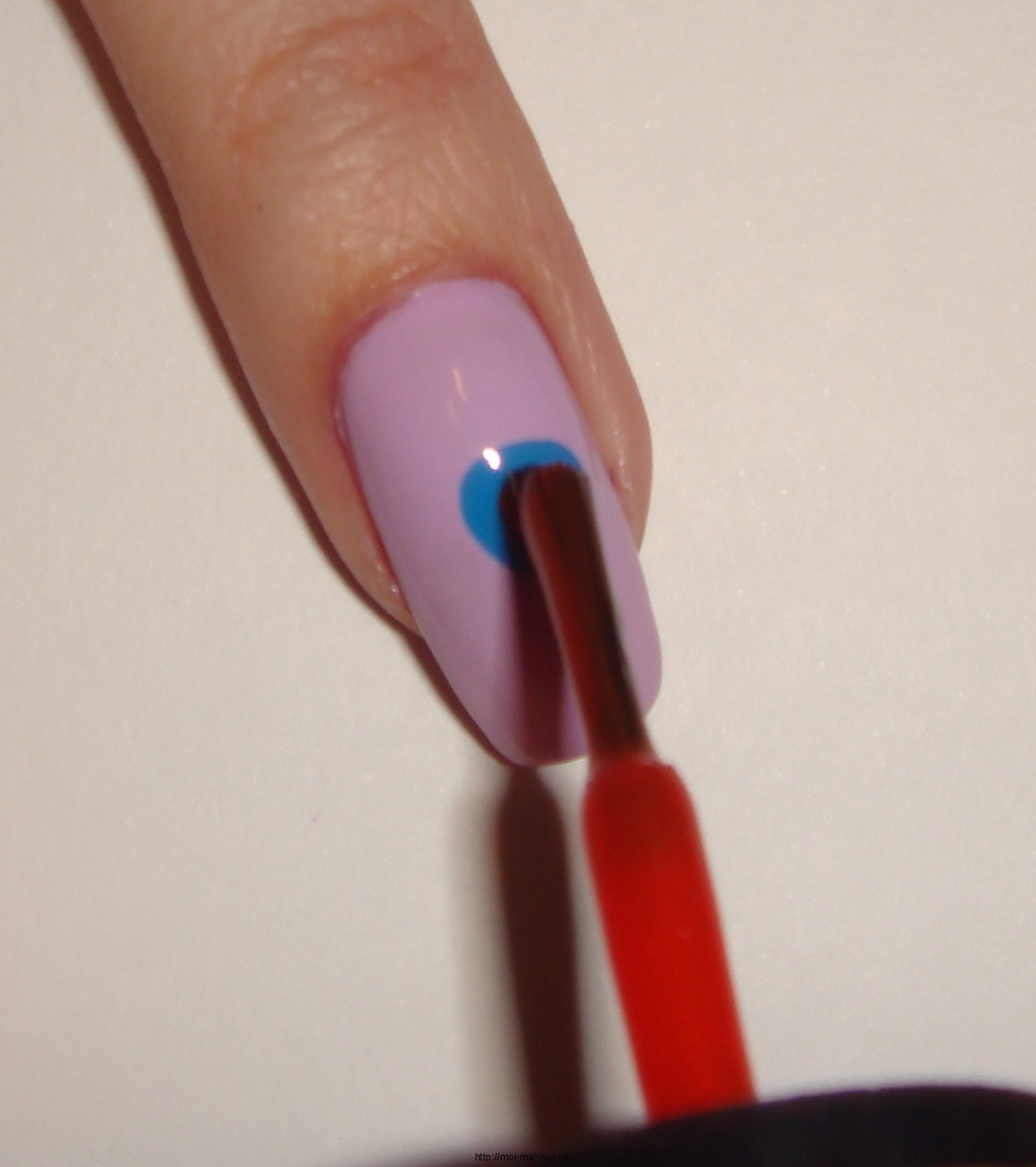 Не дожидаясь высыхания основного лака, поставьте в центре ногтя жирную точку лаком голубого цвета. Делать это нужно быстро, точным движением.