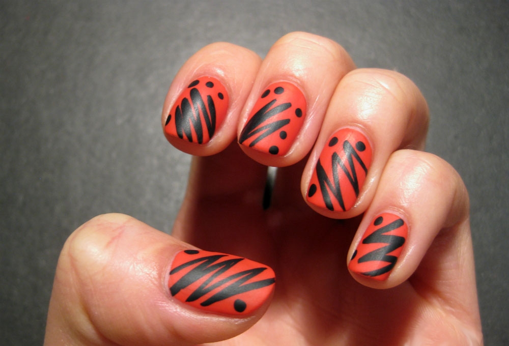 Полоска смотрится эффектно, не смотря на свою простоту. Секрет идеальной полоски: ведите ручку четко не отрываясь, края полосок делайте потоньше, а середину потолще, таким образом рисунки для ногтей получатся интереснее. Кроме полосок просто нарисовать геометрические узоры (ромбики, круги, квадратики), растительные (цветочки, листья, орнаменты), точки и проч.