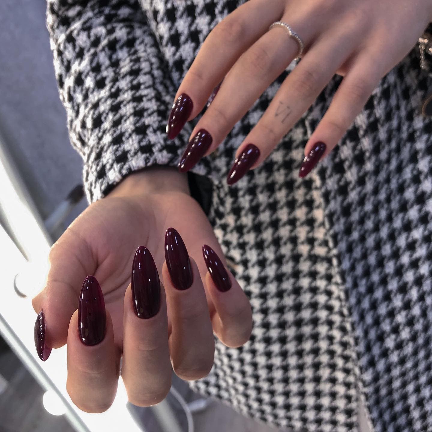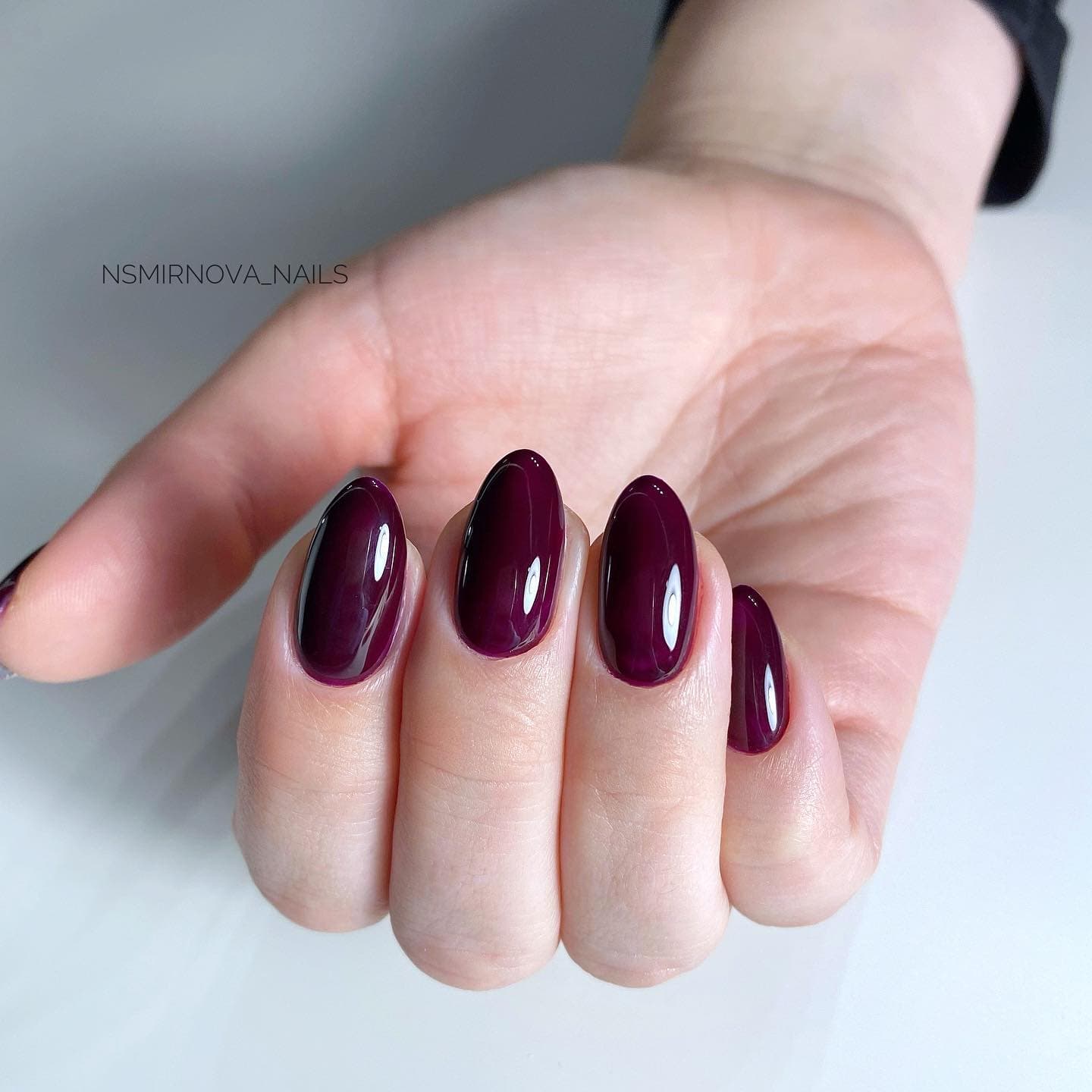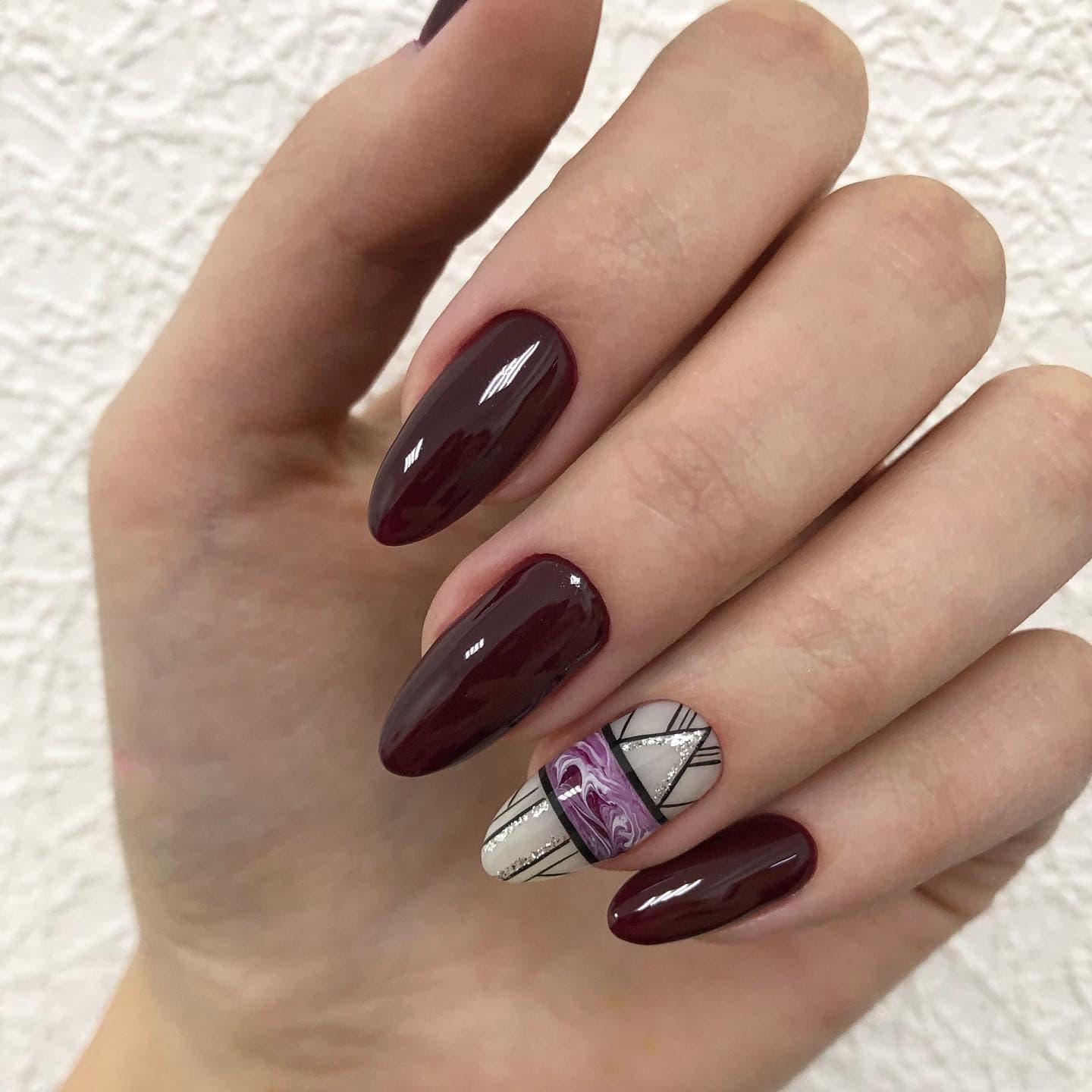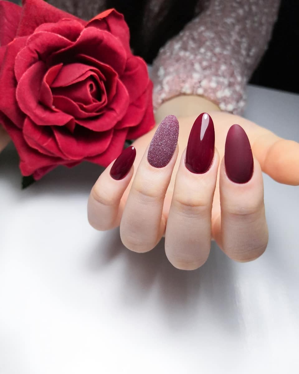 Миндаль — это универсальная форма, которой идет любой оттенок бордового, практически любой дизайн. Все ограничивается только фантазией нейл-мастера.