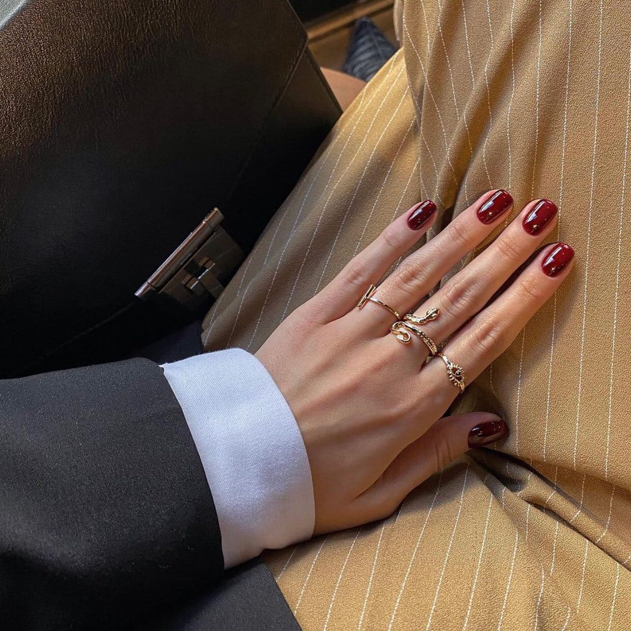 Следующие два оттенка незаменимы в холодное время года. Винный маникюр — классика зимнего и осеннего маникюра. Без него невозможно представить, например, Уму Турман в культовом фильме Тарантино (кстати, девушки с черным каре — берите на заметку), а еще он идеально сочетается с практичными темными вещами.