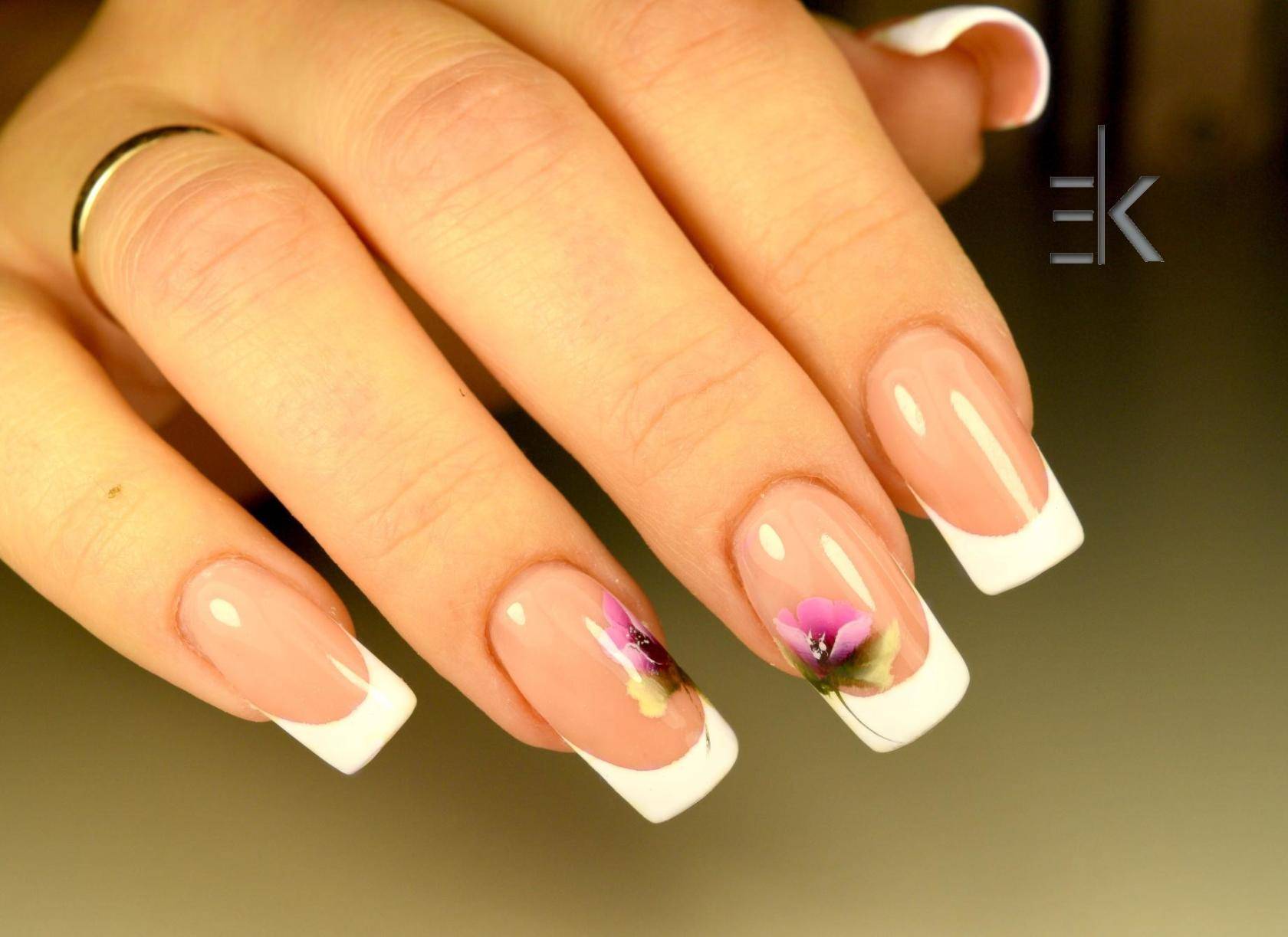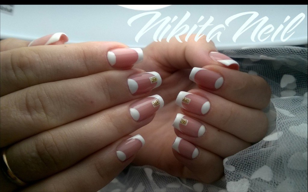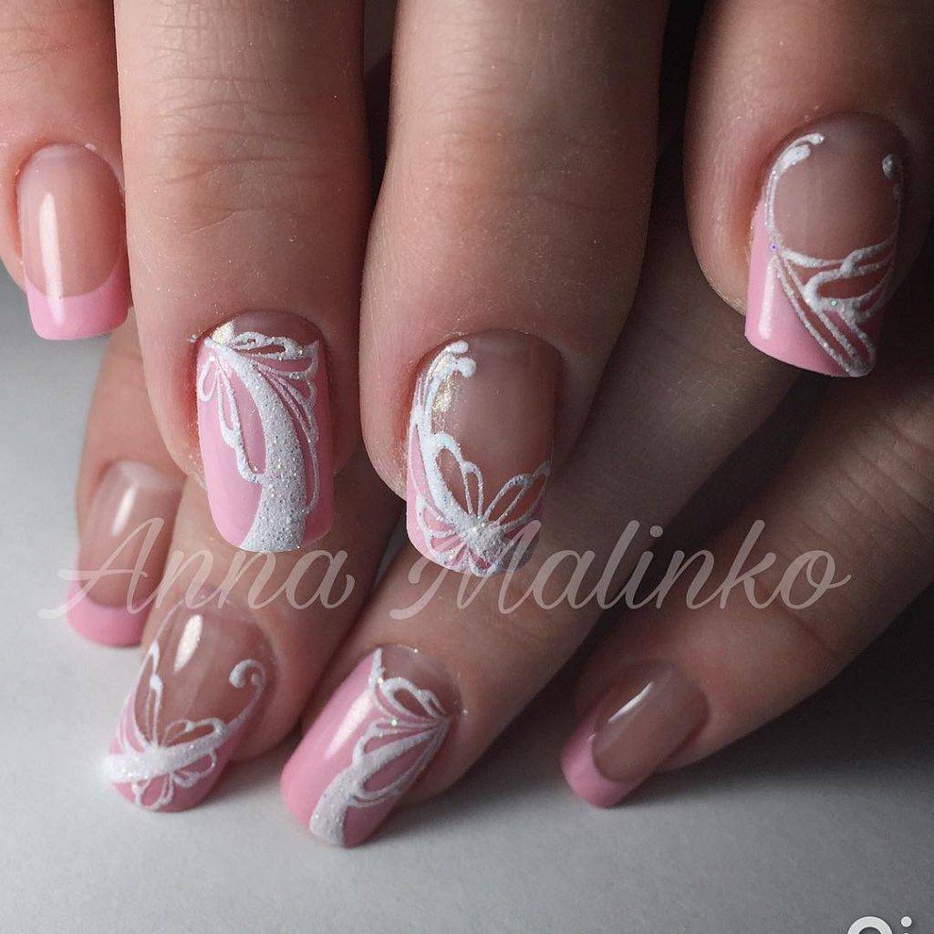 Бело – розовый френч идеально выглядит на квадратной форме ногтей, даже без применения элементов декора. Укороченная длина при этом лишь подчеркнёт изящность ваших рук. Квадратная форма является выигрышным вариантом запила ногтевой пластины в качестве основы под френч. Выполнение в гелевом исполнении или варианты росписью, элементы лепки или использование других видов дизайна, в любом своём виде квадратный свадебный френч будет актуален.