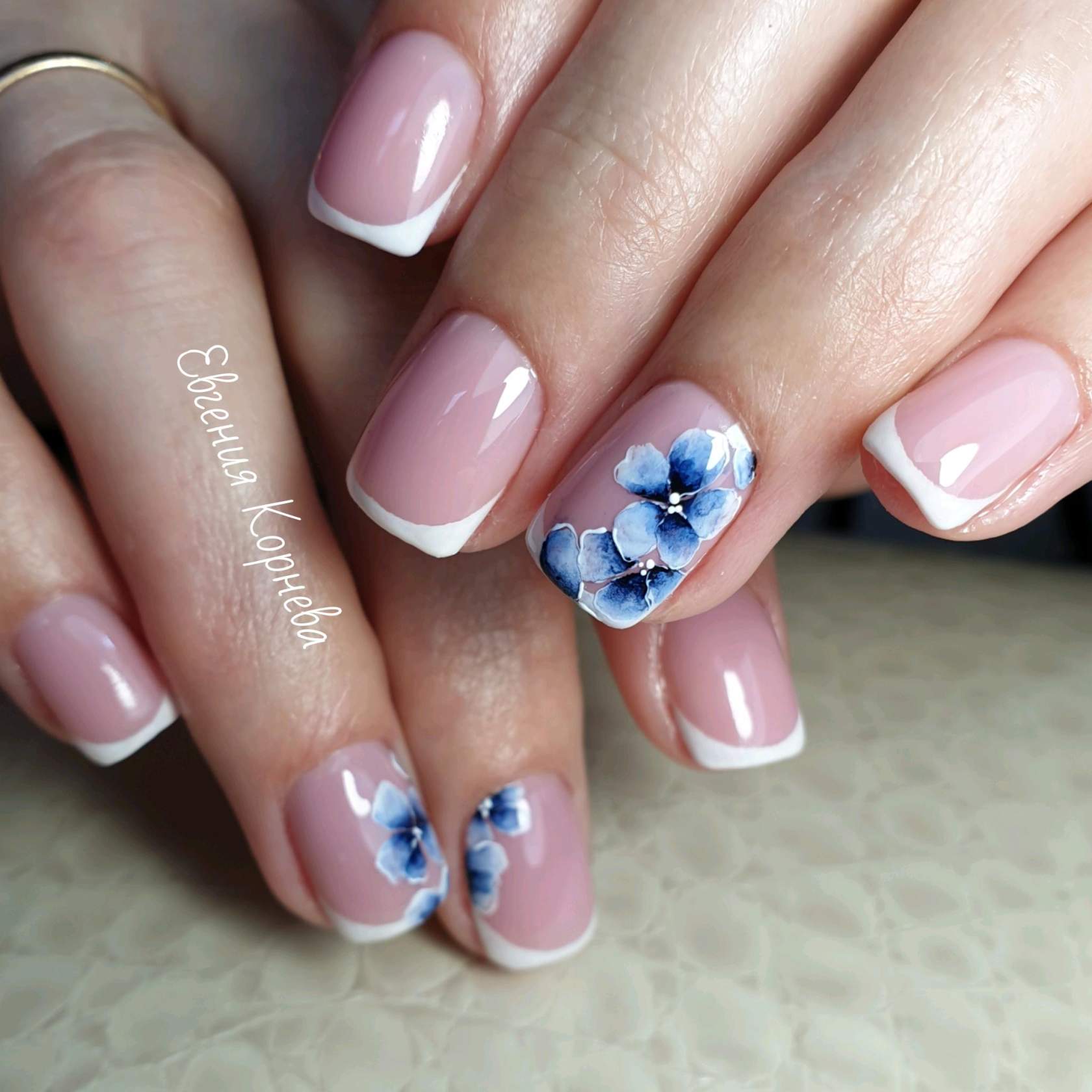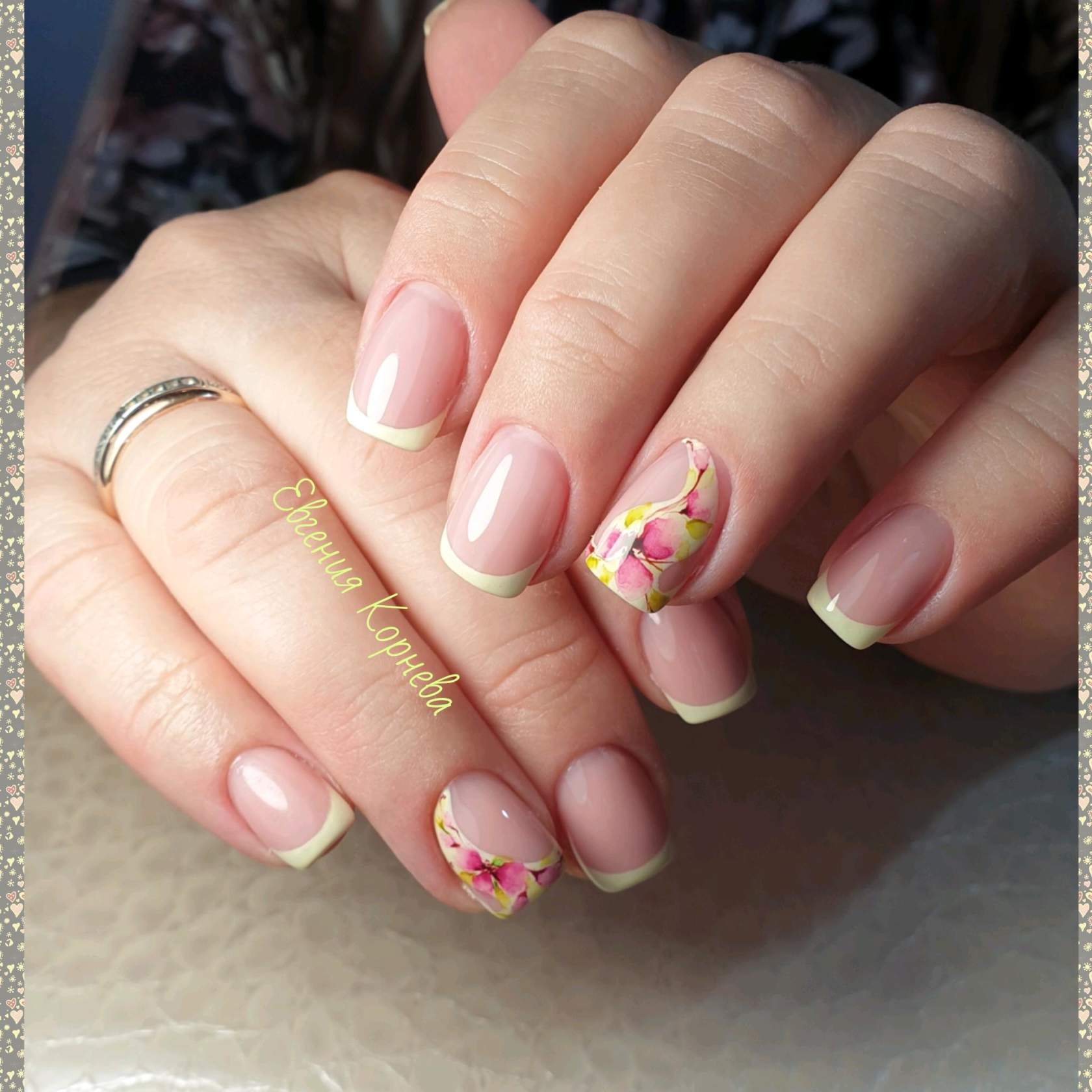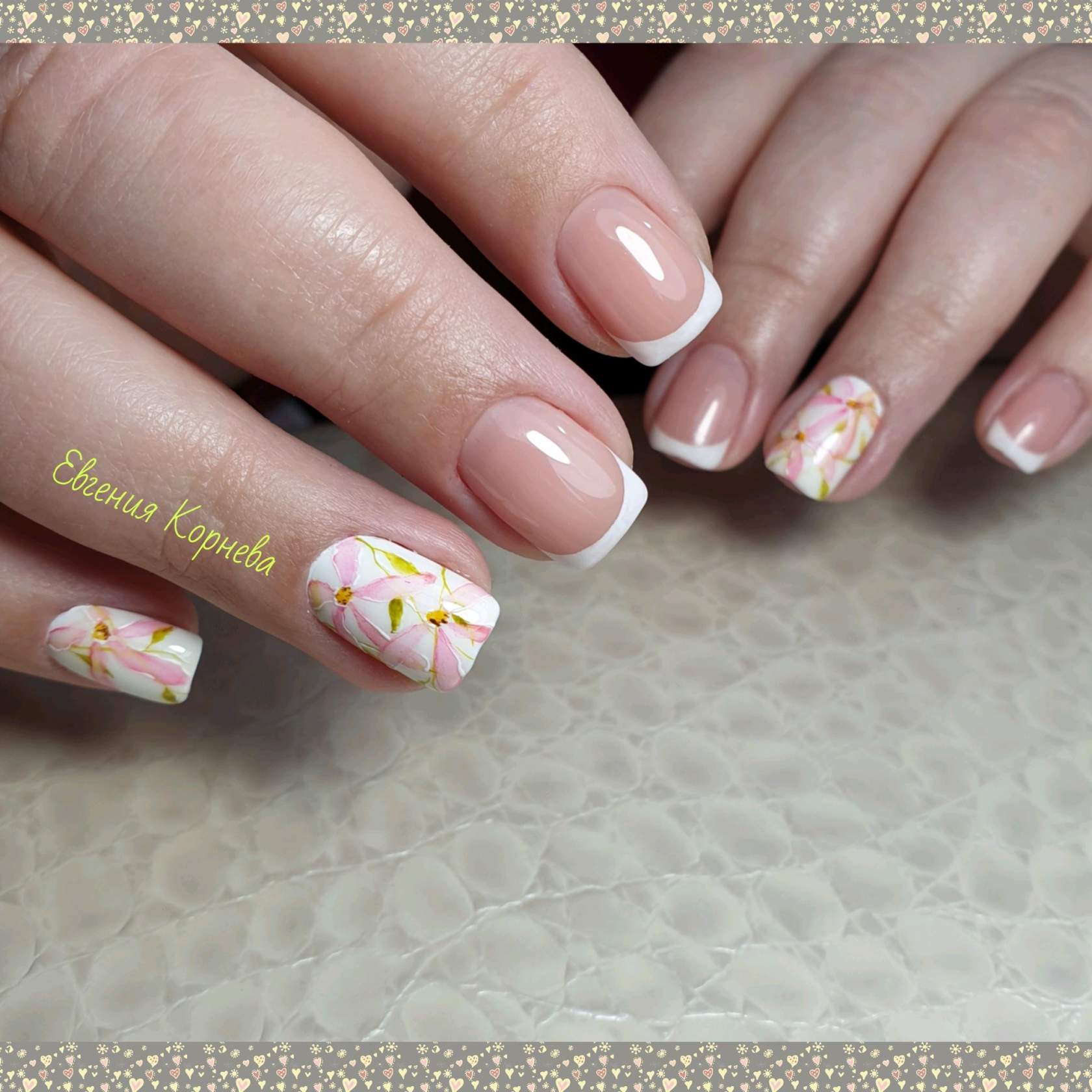 Бело – розовый френч идеально выглядит на квадратной форме ногтей, даже без применения элементов декора. Укороченная длина при этом лишь подчеркнёт изящность ваших рук. Квадратная форма является выигрышным вариантом запила ногтевой пластины в качестве основы под френч. Выполнение в гелевом исполнении или варианты росписью, элементы лепки или использование других видов дизайна, в любом своём виде квадратный свадебный френч будет актуален.