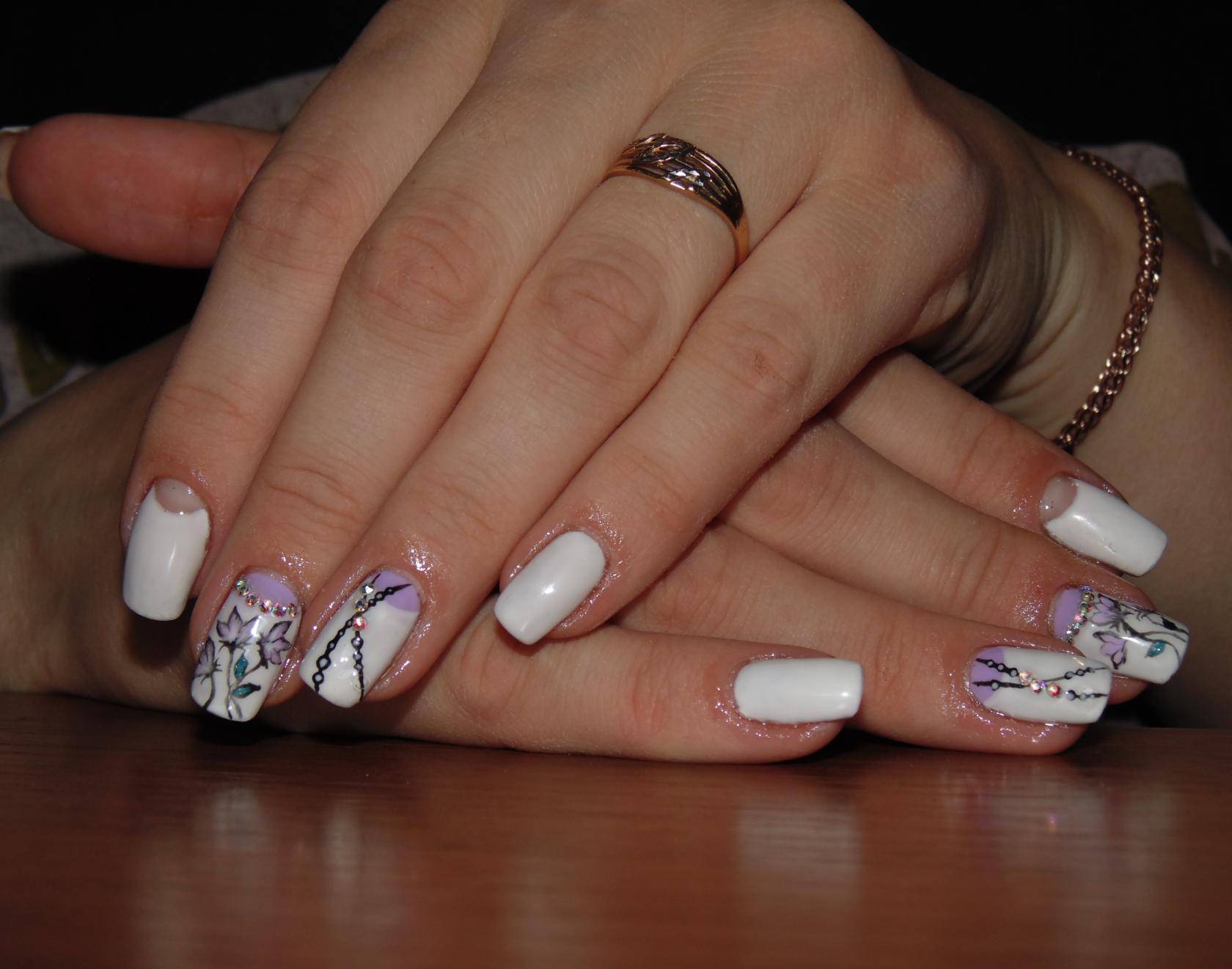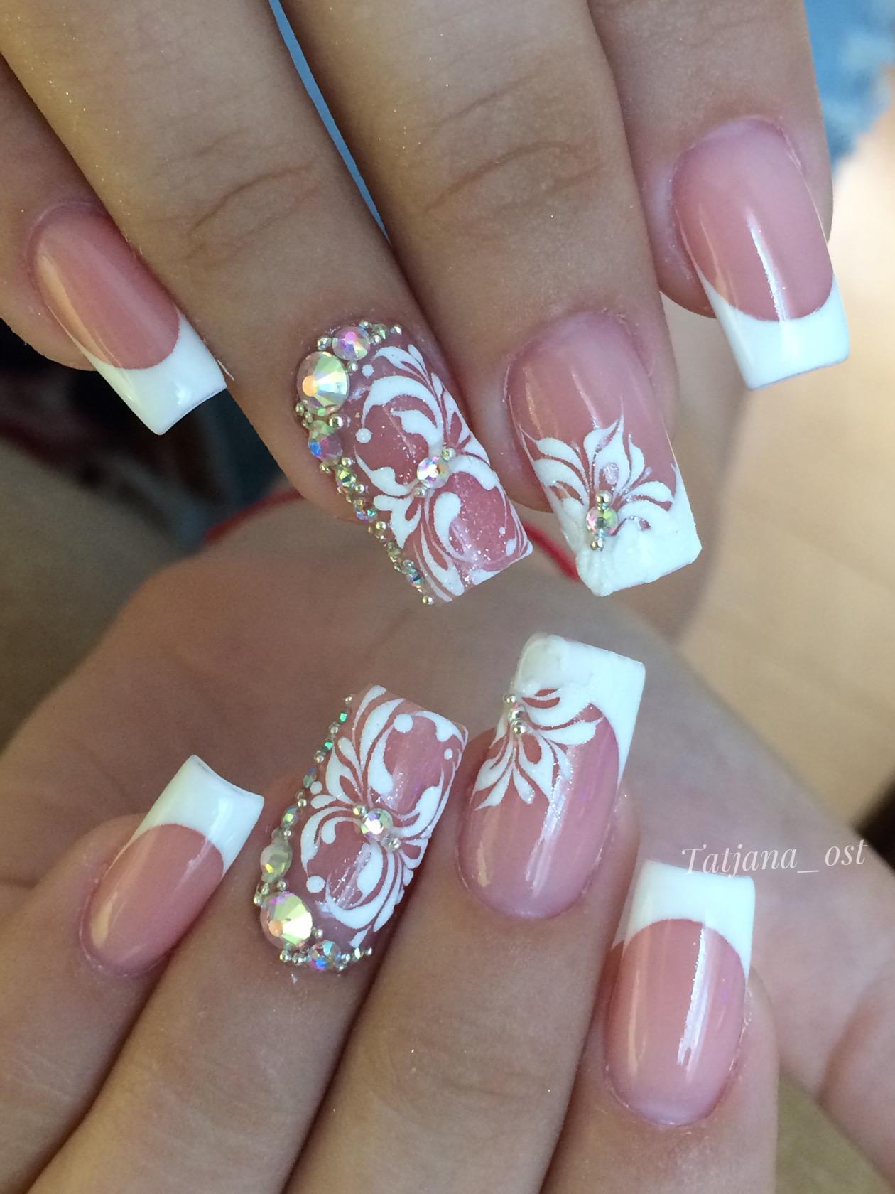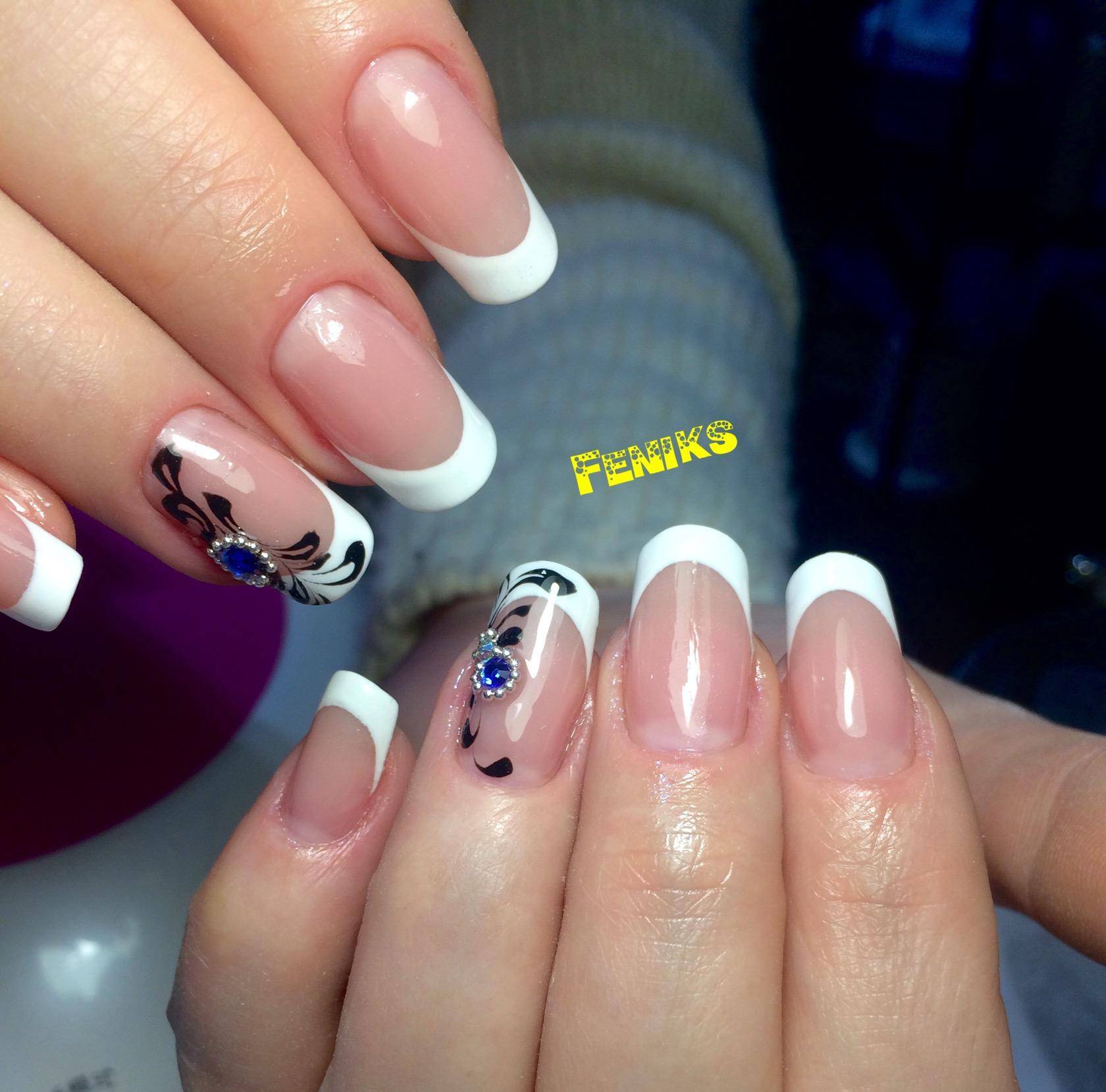 Можно использовать в дизайне и другие рисунки. Если их сделать белой акриловой краской, это будет замечательным дополнением к белому френчу. Рисунок можно сделать в виде различных завитков. В круг каждого завитка поместить стразик. Получится естественно и оригинально.
