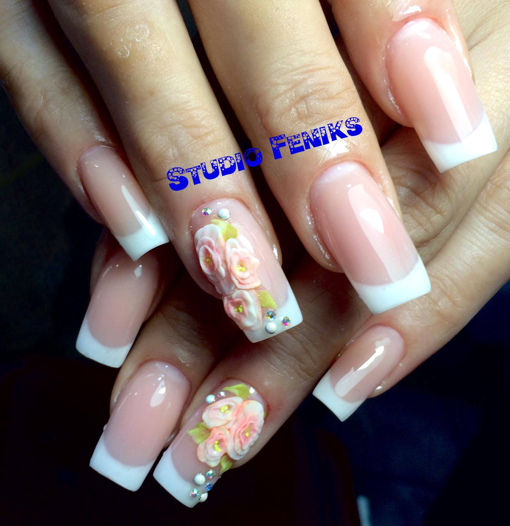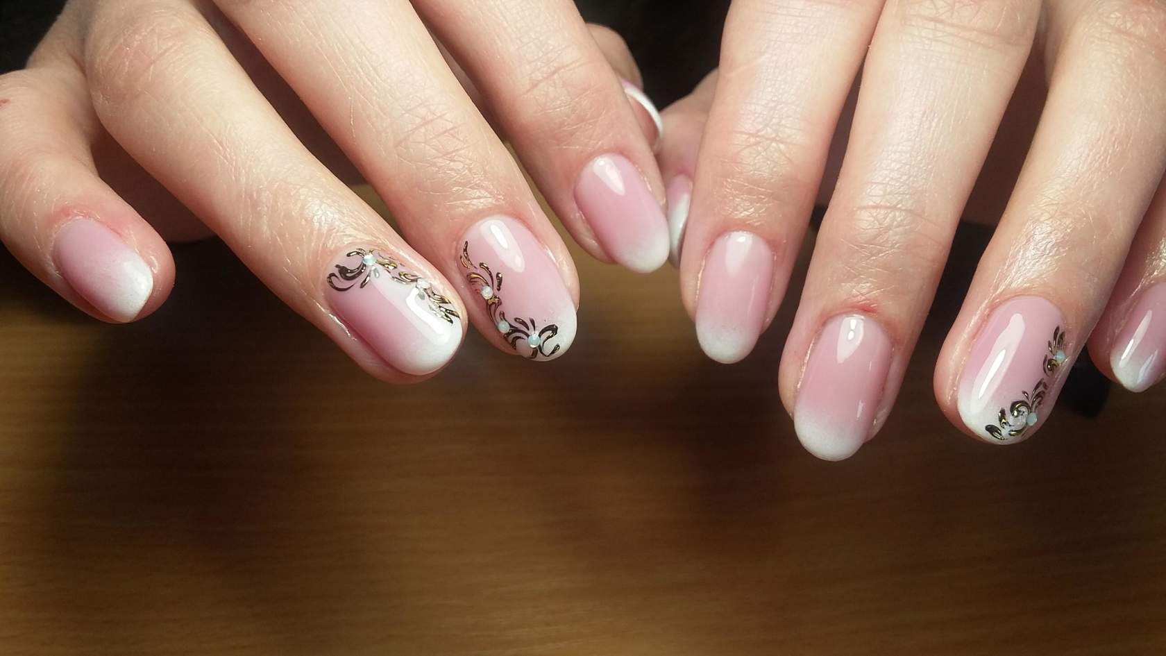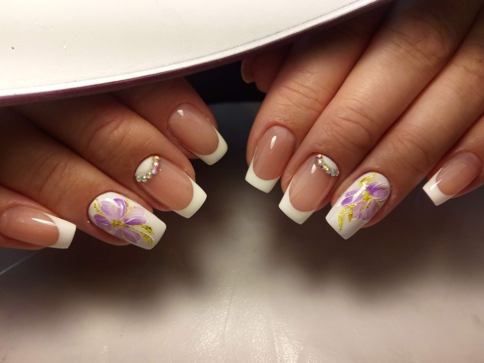 Можно использовать в дизайне и другие рисунки. Если их сделать белой акриловой краской, это будет замечательным дополнением к белому френчу. Рисунок можно сделать в виде различных завитков. В круг каждого завитка поместить стразик. Получится естественно и оригинально.