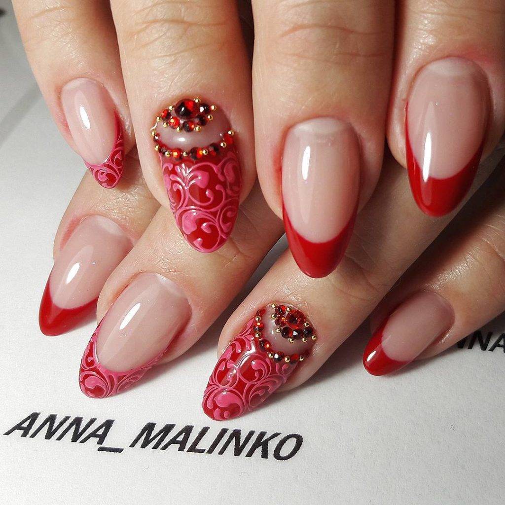 - Яркий насыщенный френч (лунный, «эмптиспейс», яркий кончик).
