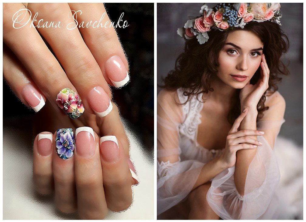 В свадебном маникюре 2020-2021 доминируют цветочные рисунки, флористические мотивы, техника вуаль, омбре. Для невест, которые предпочитают простой, но классический стиль, подойдет французский маникюр и его вариации. Сторонницам практичности советуем выбирать короткую (до 5 мм) или среднюю длину ногтей формы овал или миндаль. Они красиво выглядят на свадебных фото, где пальчикам невесты уделяется много внимания.