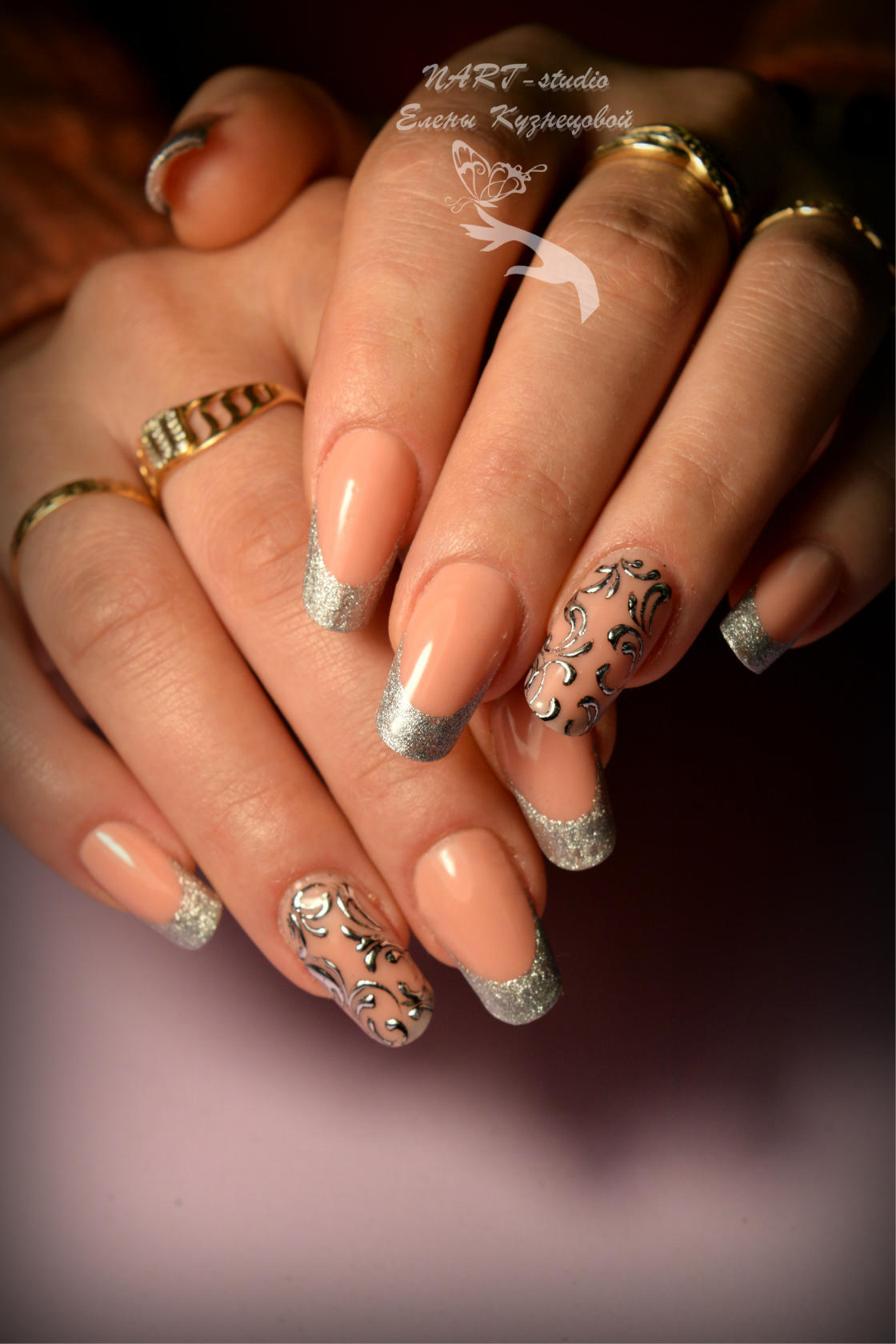 Маникюр невесты должен быть лаконичным, элегантным и ненавязчивым и гармонировать с прической, макияжем и образом в целом. Цветовая гамма состоит в гармонии с подвенечным нарядом – выбирайте белые, нюдовые, бежевые, кремовые, персиковые, бледно-розовые, пастельные, серебряные оттенки. Яркие цвета будут уместные только в виде акцентов в основном дизайне ногтей. Подчеркнуть изящность нейл-арта можно с помощью стразов, бусин, пудры, камифубуки, фольги, глиттера, втирки.