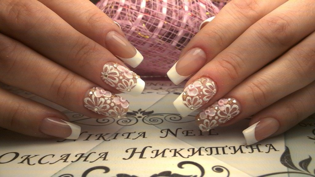 Классика никогда не выйдет из моды, а французский маникюр с белым френчем прекрасно подойдет для наряда невесты. Но для такого случая к классическому образу нужно добавить что-нибудь оригинальное. Например, кружево. Кружевные кусочки накладываются на ноготь с небольшим заходом на область френча. Сверху кладем слой прозрачного лака или геля.