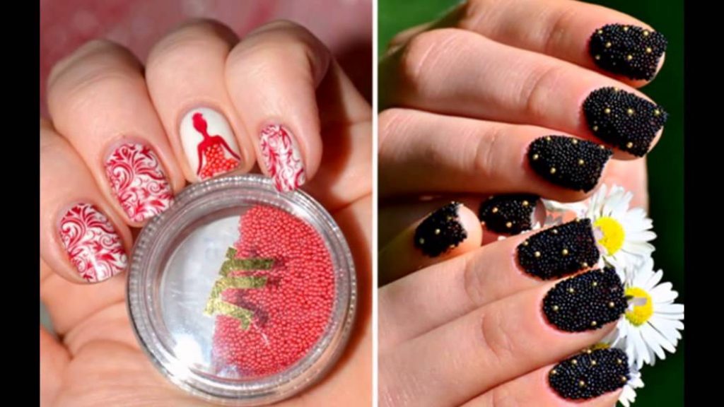 Выбор цвета и размера аксессуаров зависит от того, какой дизайн вы желаете создать. Наиболее популярным является икорный маникюр, о котором упоминалось выше. Для его создания понадобятся шарики небольших размеров. Если вы впервые работаете с этими элементами, стоит отдать предпочтение одноцветному варианту.
