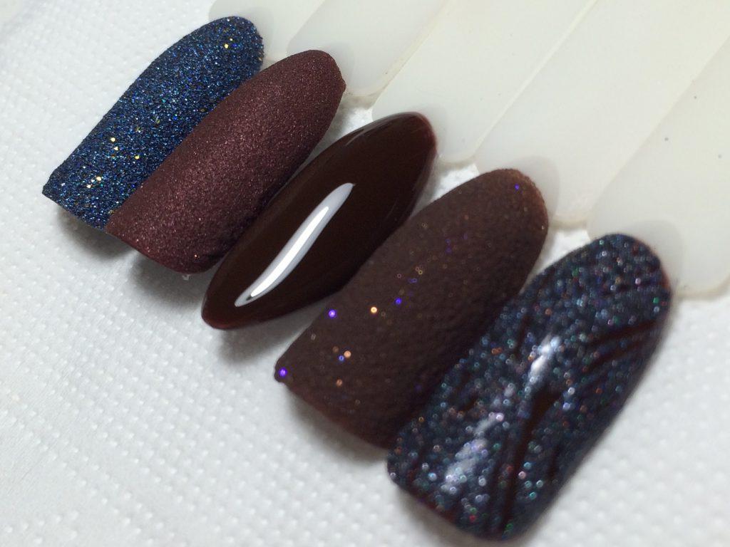 Первый способ — это крупинки шарообразной фирмы, которые называются бархатный песок. На рынке nail-арта представлена широкая цветовая гамма необычного песка. В таком покрытии блестки должны быть крупные, потому что мелкие легко утапливаются в гель-лаке.