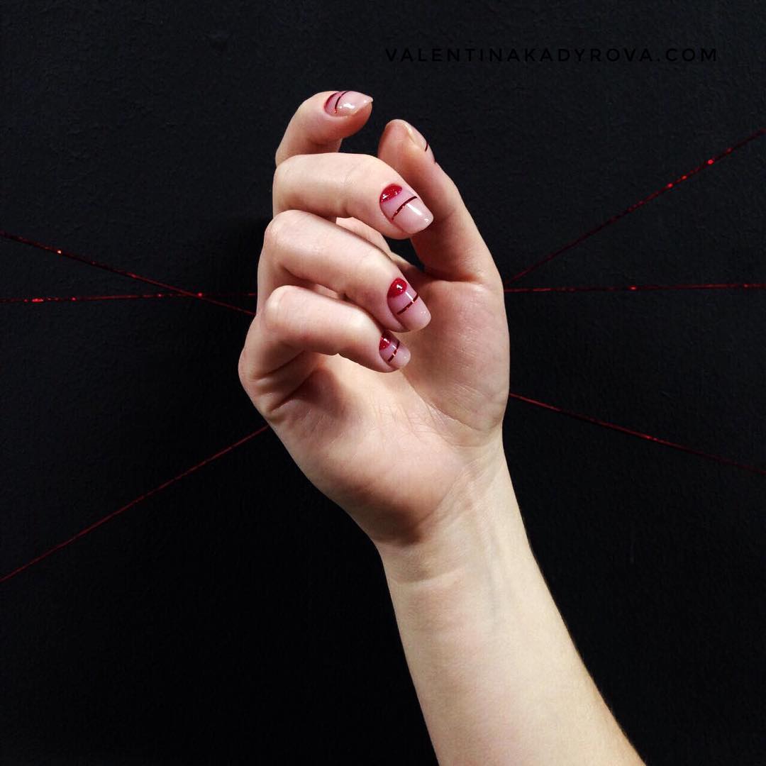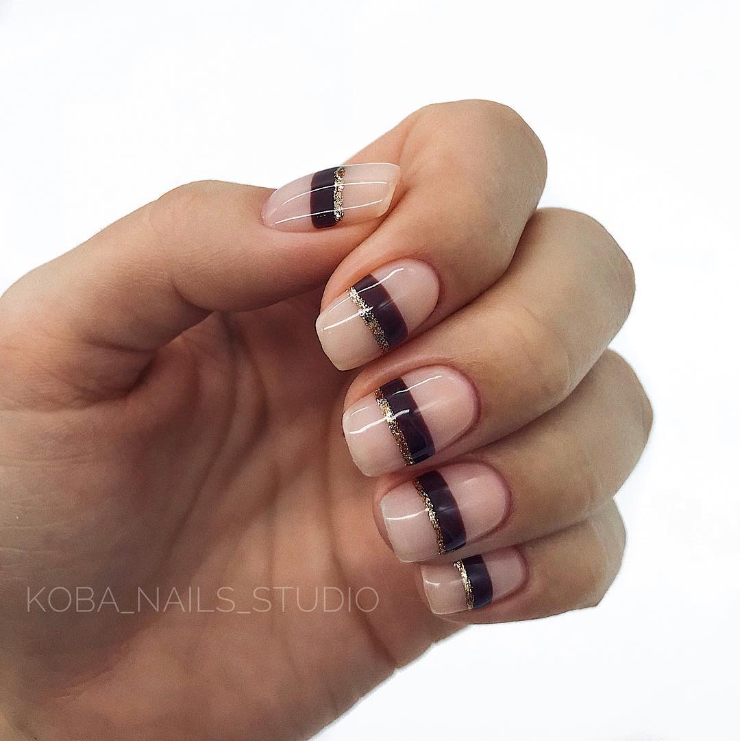 Весьма необычная вариация полосатого маникюра – дизайн с прозрачными полосками. Часто его сравнивают с рисунком в стиле «negative space». Это значит, что при создании рисунка остается не закрашенной определенная часть. В данном случае это будут полоски. Что касается оттенков, то такой маникюр отлично выглядит как в нейтральных тонах, так и в более ярких, насыщенных. Поэтому выбирайте исходя из личных предпочтений, а также сезонности.