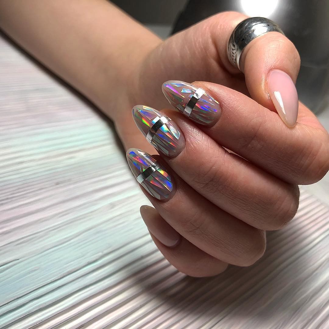 Голографический маникюр. Для смелого декора рекомендуем голографическую фольгу. Яркий и броский дизайн — отличное решение для молодежи. Если вы сомневаетесь в таком покрытии, то можно нарисовать его только на двух ногтях на каждой руке. Такой нейл арт очень актуален в этом сезоне, ведь зеркальный блеск сейчас в тренде.